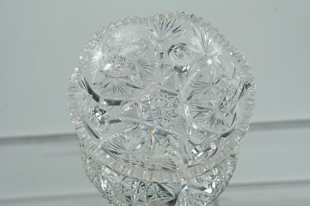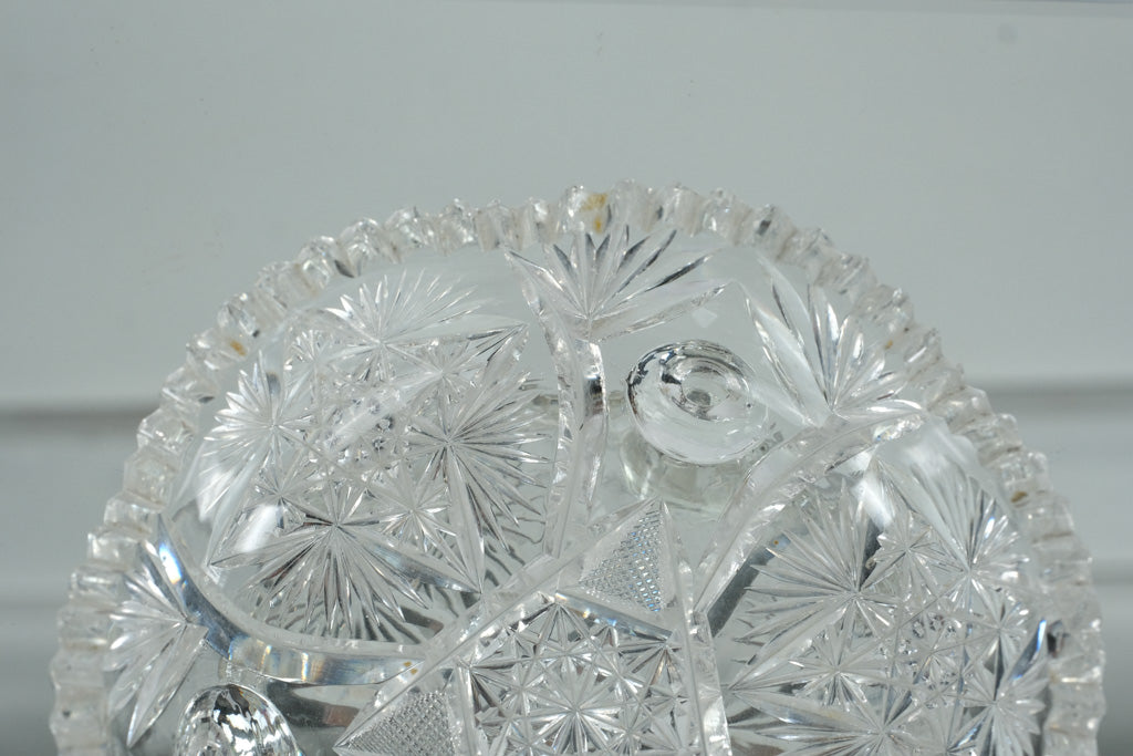 This stunning American Brilliant Cut Glass (ABCG) bowl features the classic brilliance and craftsmanship that defined late 19th- to early 20th-century glassmaking. It’s beautifully cut with intricate starburst, fan, and hobstar motifs across its surface, and rests elegantly on three solid glass feet. The sawtooth rim and deep geometric cutting catch the light from every angle, creating a dazzling sparkle.