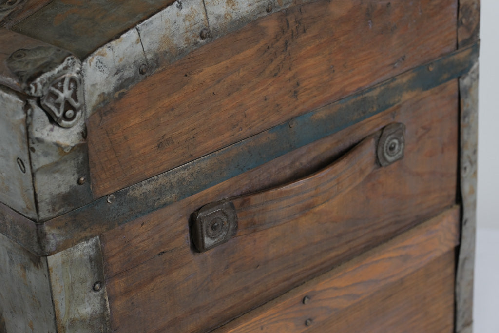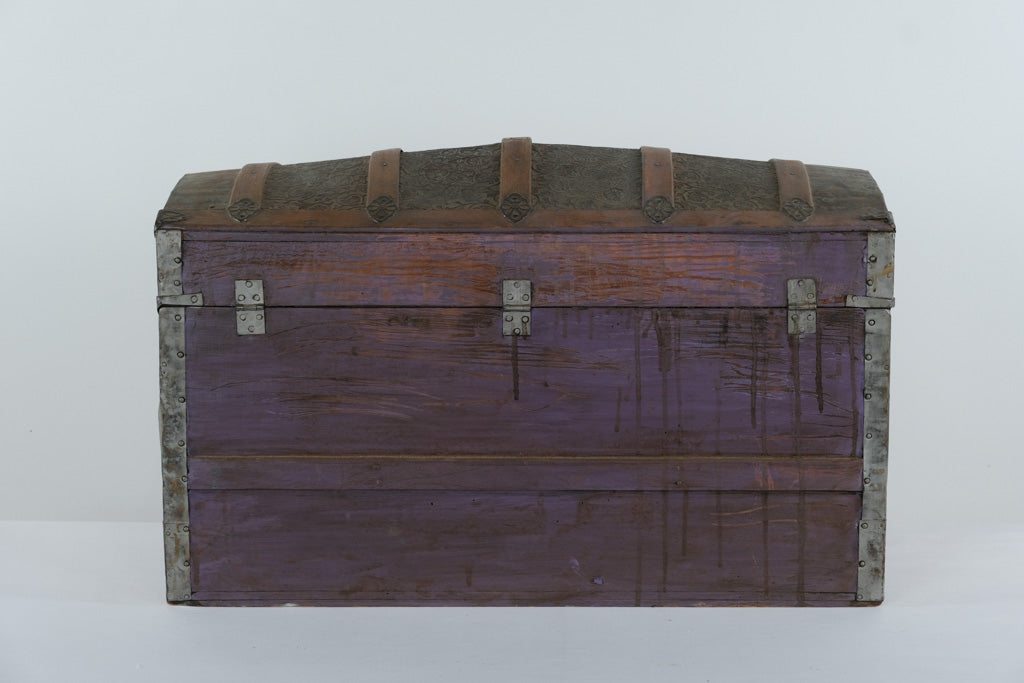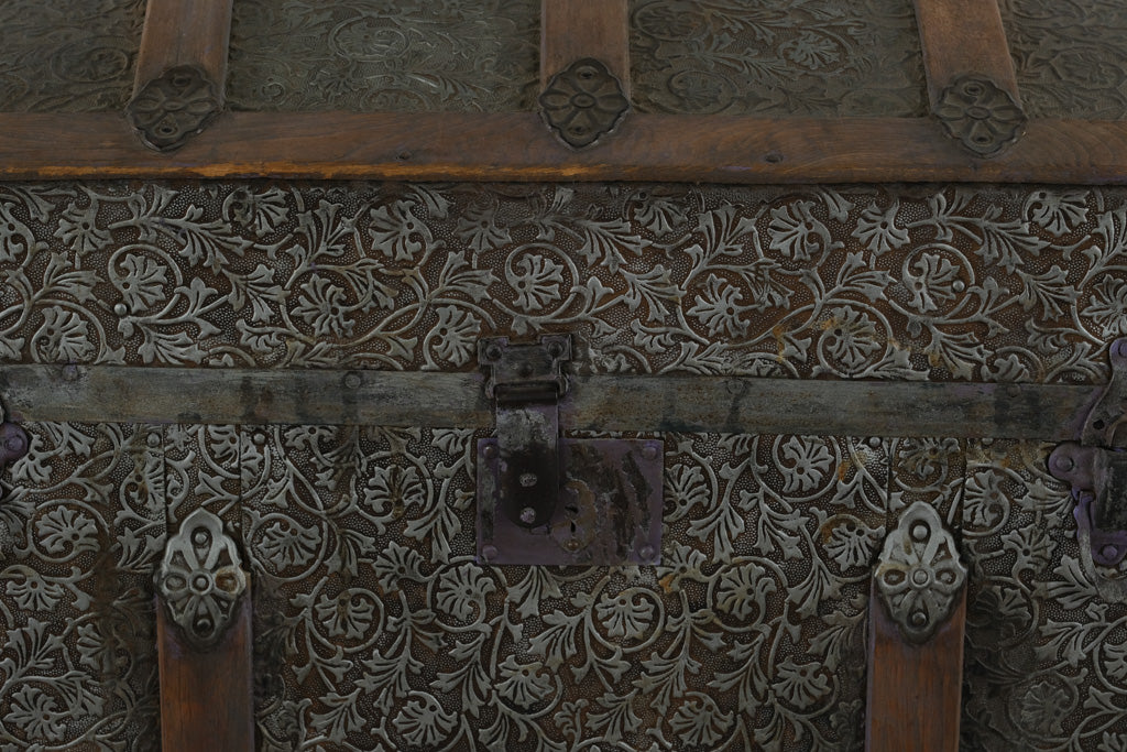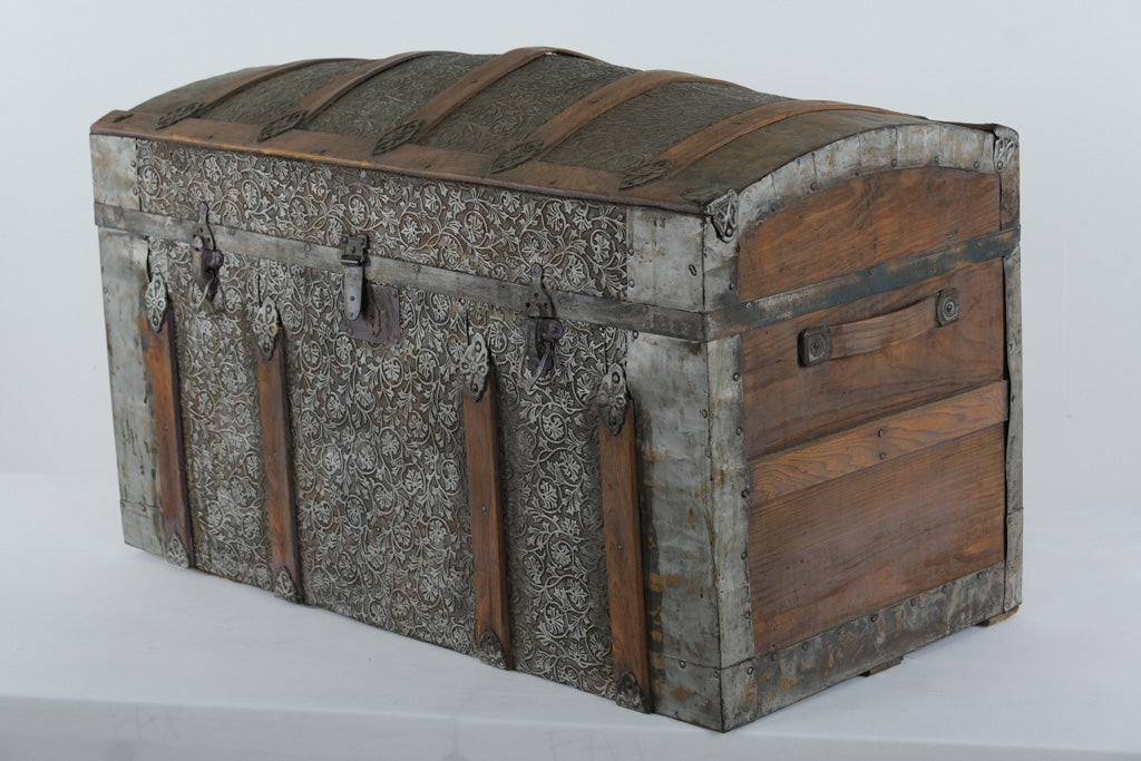 This is a beautiful antique dome top steamer trunk, featuring decorative embossed tin panels with a floral motif, accented by hardwood slats and ornate metal hardware. The trunk has its original side leather handles (aged), front latches, and a domed top design that makes it stand out as a true period piece.