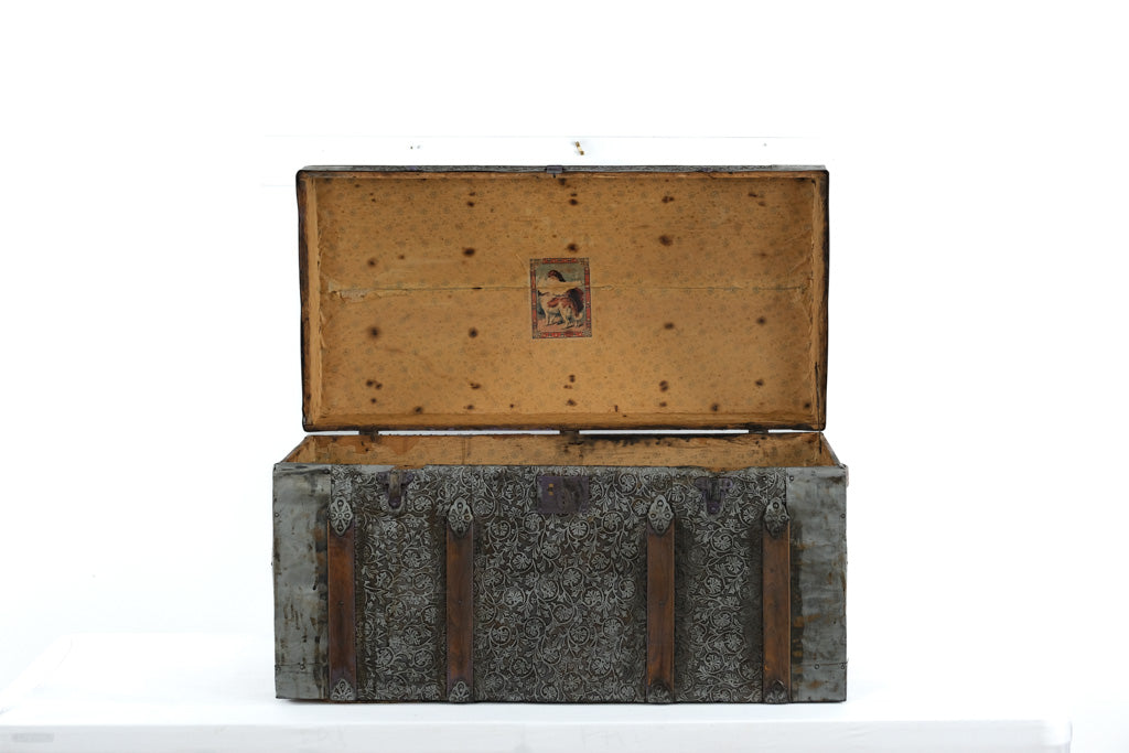 Inside, it retains its original paper lining with a lift-out tray and compartment, showing age-appropriate wear and patina. Perfect for collectors of antique trunks, but also highly functional as a coffee table, blanket chest, or stylish storage solution in today’s home.