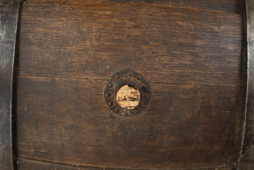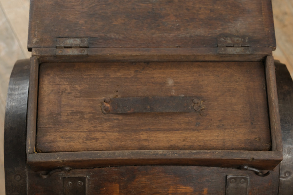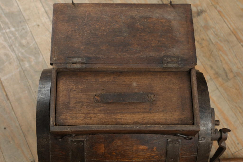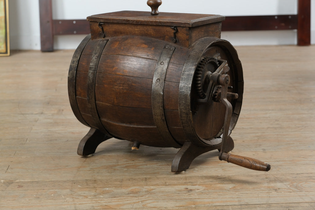 This beautifully weathered antique barrel butter churn captures the rustic charm of Old World craftsmanship. Built from rich, aged hardwood and reinforced with hand-forged iron bands, this rotating drum churn features a side-mounted iron crank and exposed gear system—classic traits associated with European churns from the late 1800s to early 1900s.