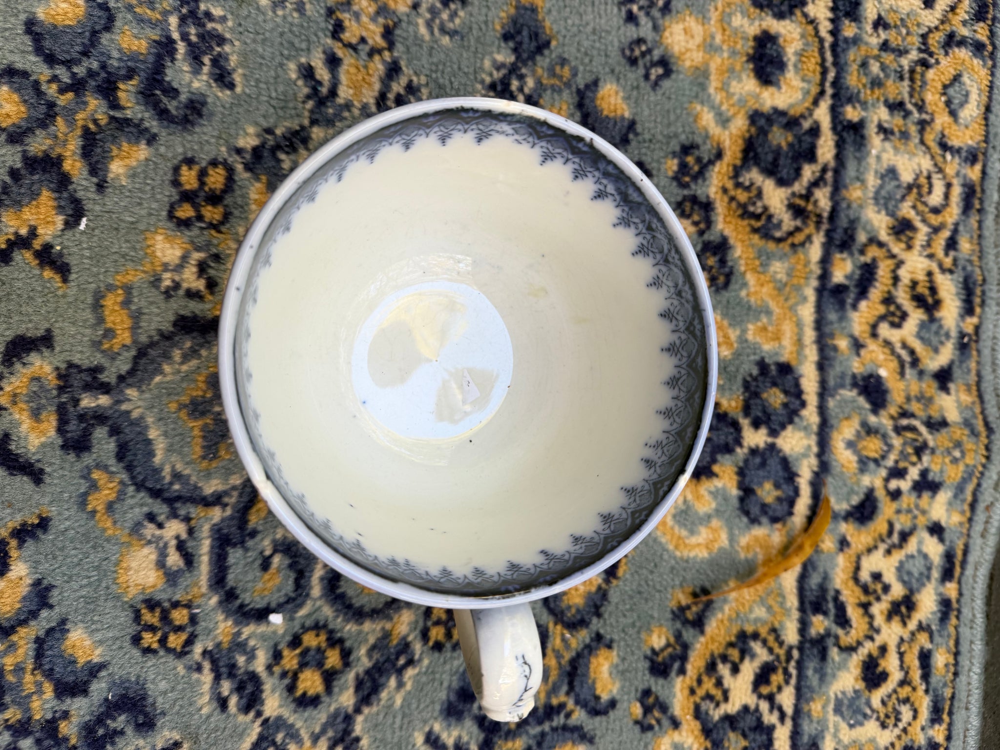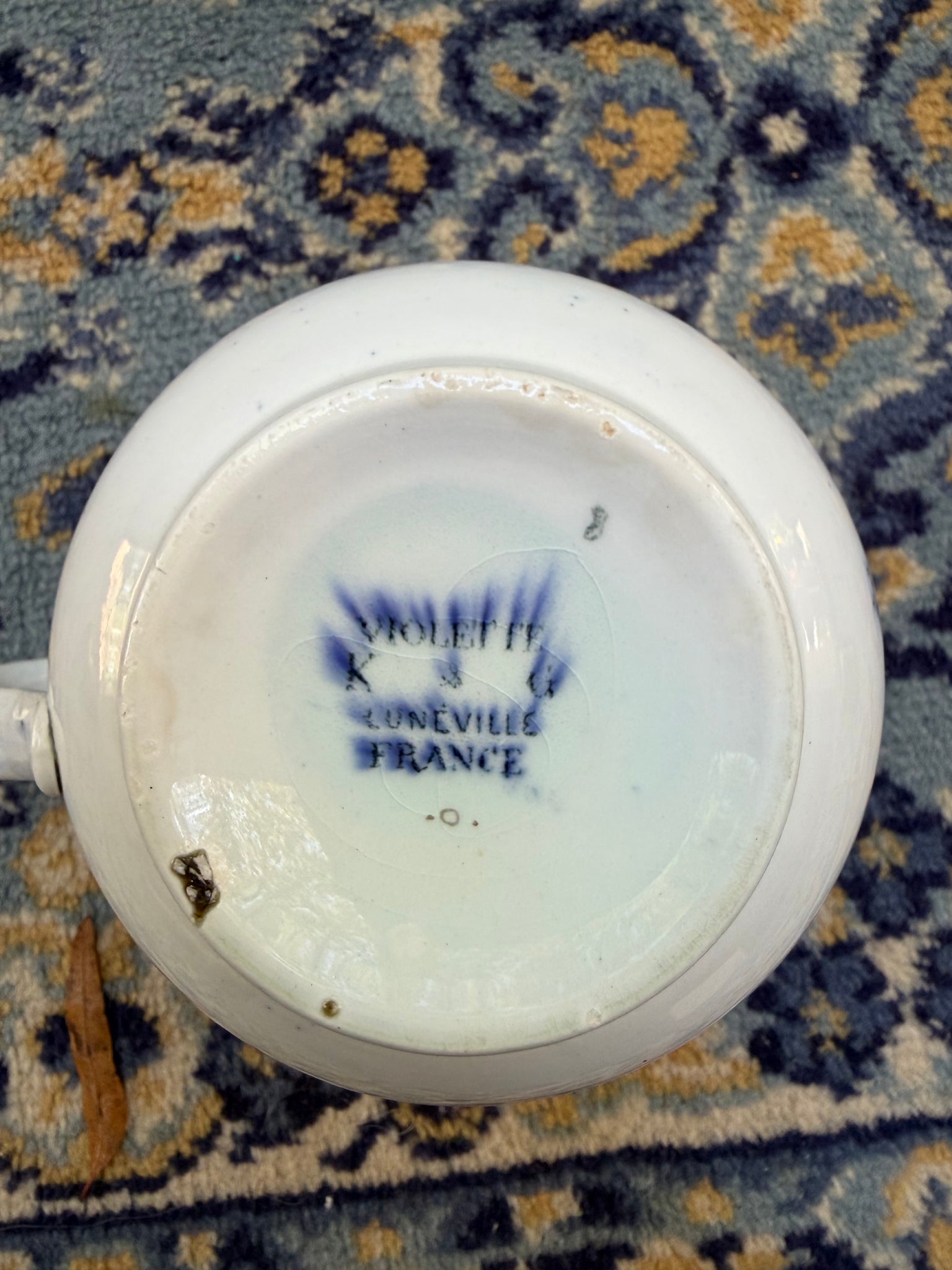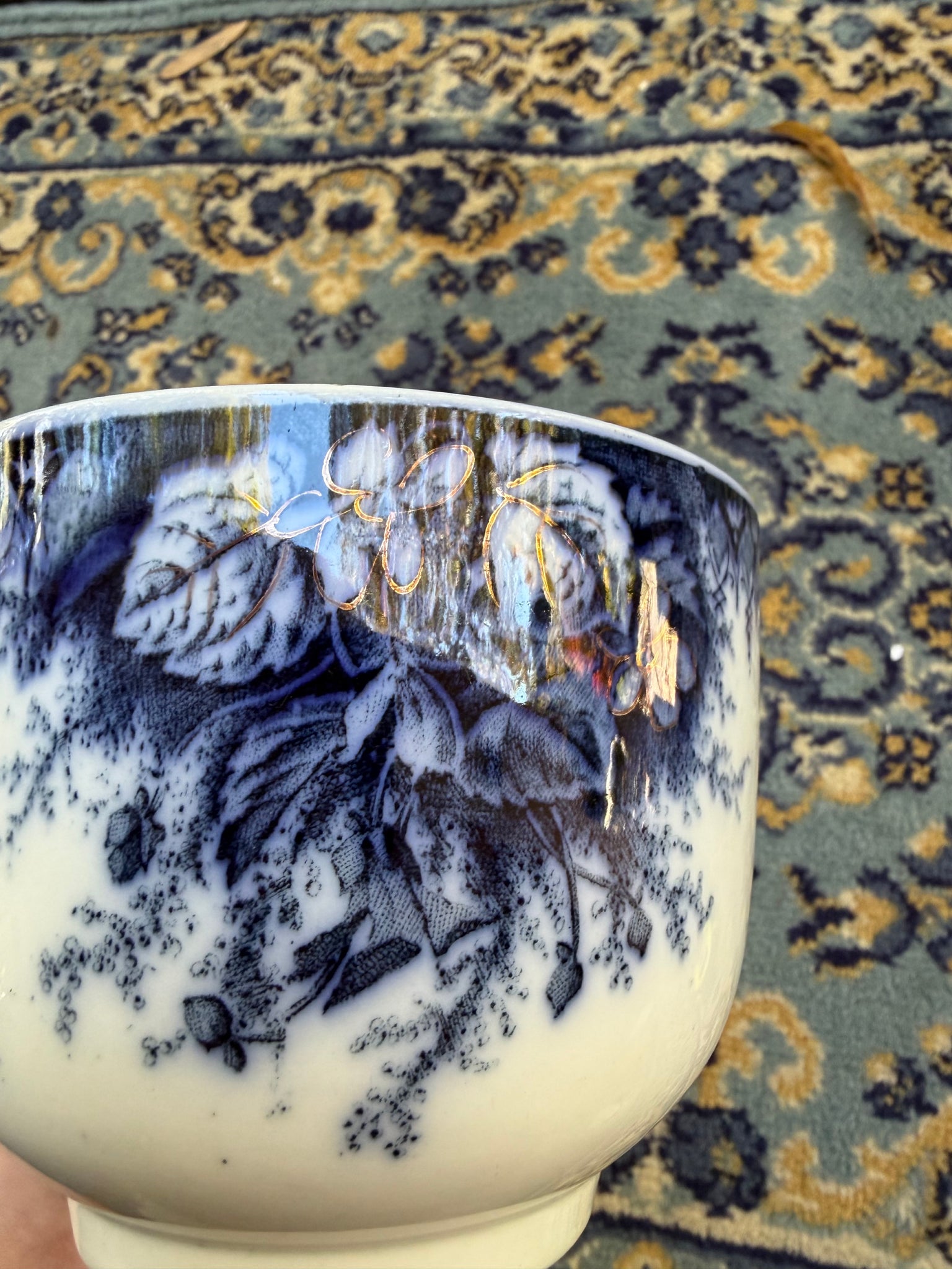 A striking example of late 19th-century French artistry, this Keller & Guérin Lunéville oversized porcelain cup showcases the timeless beauty of the flow blue technique. The rich cobalt wash gently blurs the floral design, creating a romantic, watercolor-like effect characteristic of the Victorian era. Accented with delicate gold detailing, it reflects the craftsmanship that made Lunéville ceramics renowned throughout Europe.