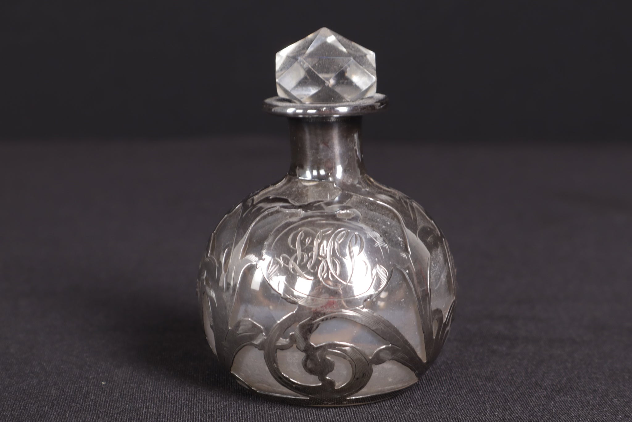 Add a touch of elegance to your collection with this antique sterling silver overlay glass perfume bottle, complete with its original faceted crystal stopper. Measuring 3" in diameter and 4" tall, this charming piece features a graceful Art Nouveau-style scrolling silver overlay design with a central engraved monogram for a personalized touch. The clear glass body is accented by the gleaming silver, making it a striking display item as well as a functional perfume or cologne bottle.