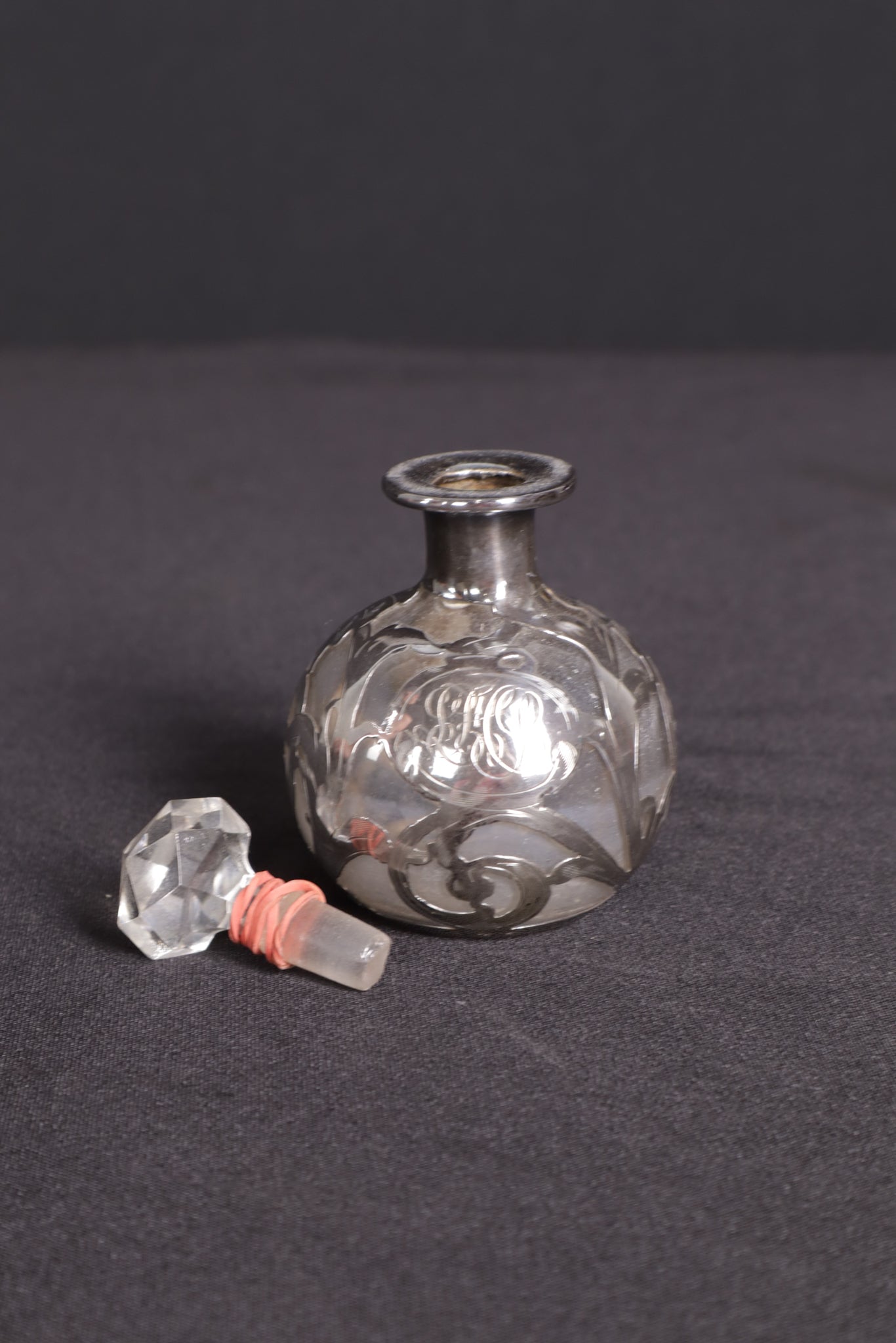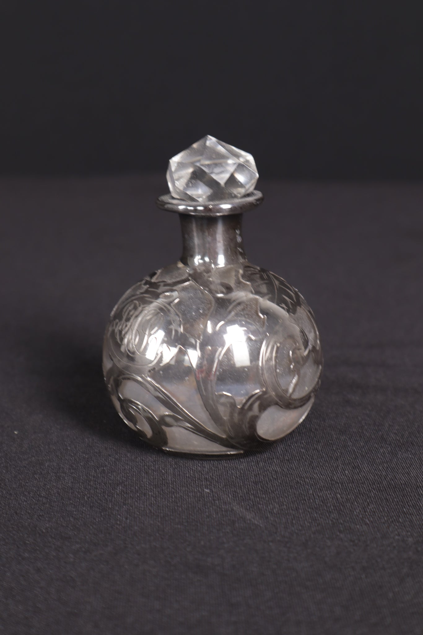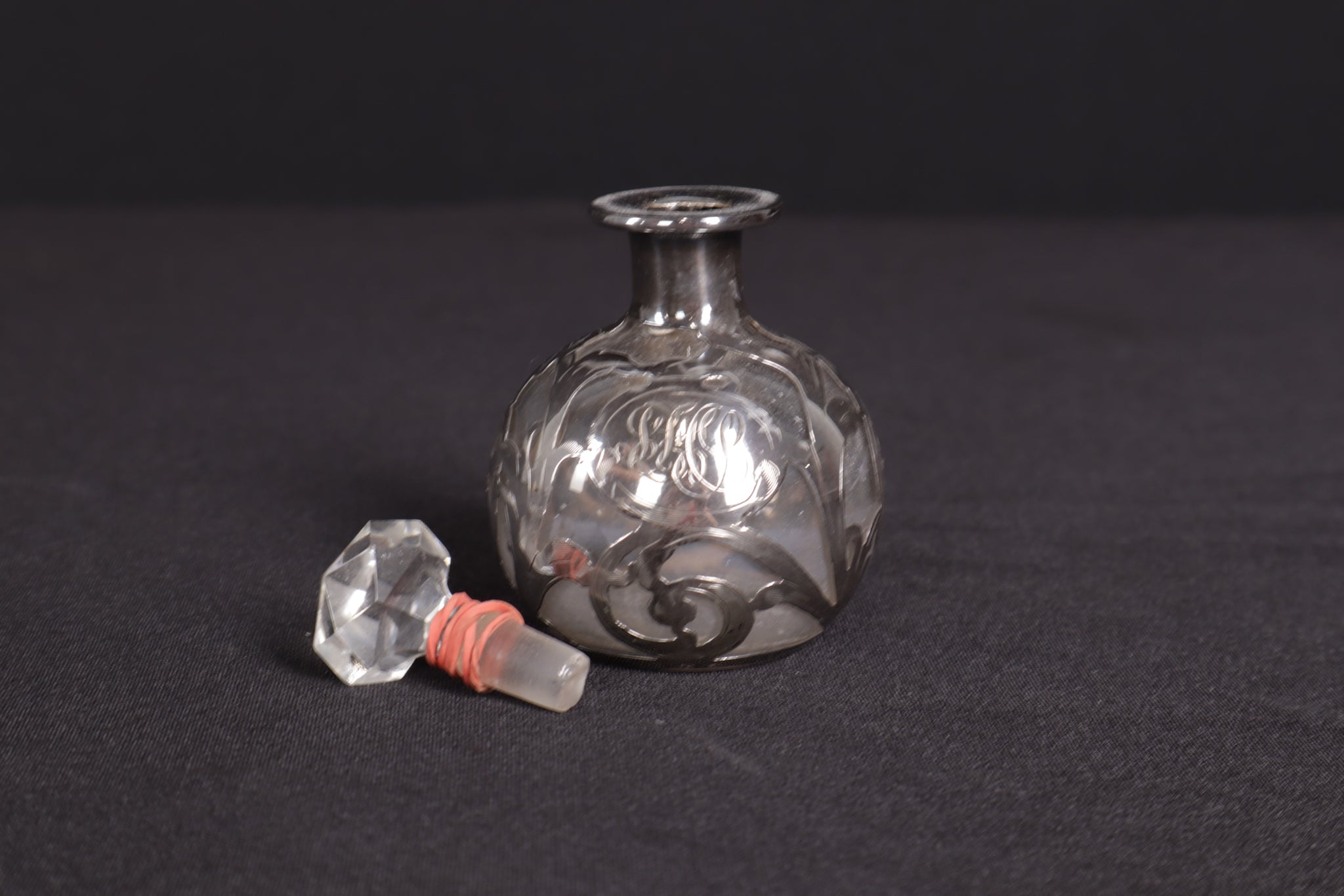 Material: Glass with sterling silver overlay; faceted cut-glass stopper