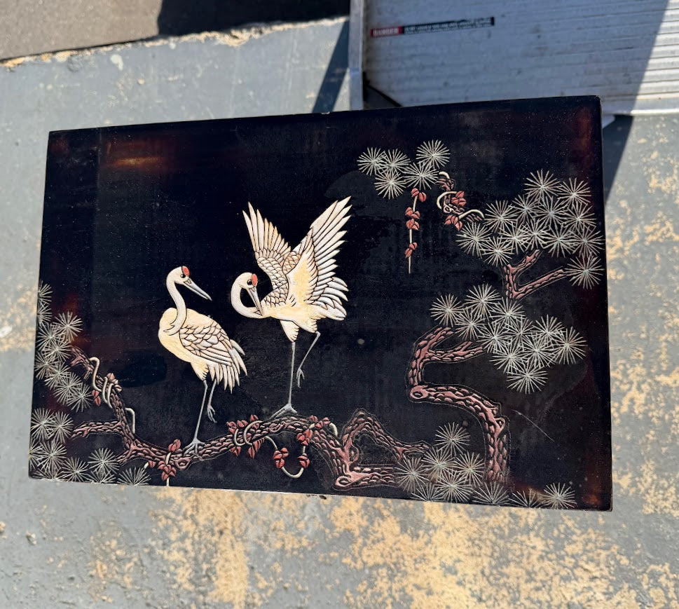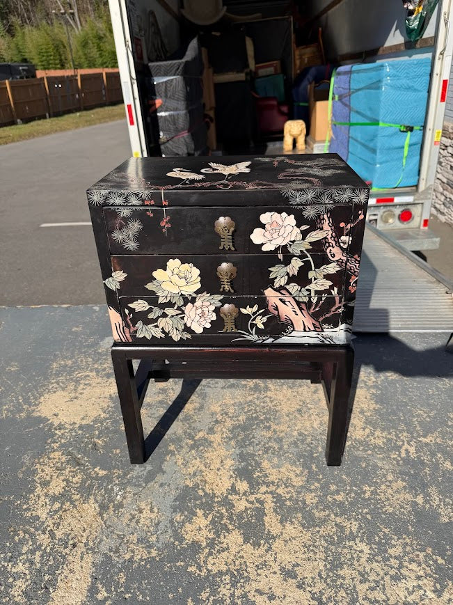 A captivating blend of artistry and function, this petite Asian-style chest brings elegance and storytelling to any interior. Its black lacquered finish provides a dramatic backdrop for hand-painted florals, cranes, and pine boughs—classic symbols of longevity and natural harmony—resulting in a piece that feels both decorative and refined.