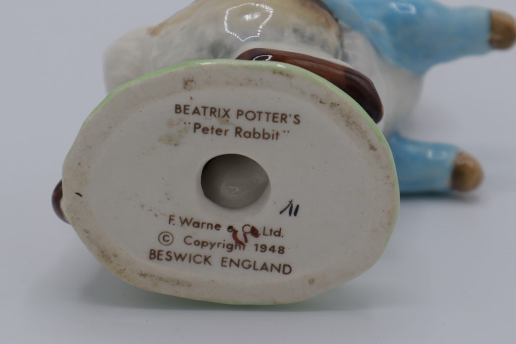 This charming porcelain figurine of Peter Rabbit, from the beloved stories by Beatrix Potter, was made in England by Beswick Pottery. With his signature blue jacket and lively pose, Peter Rabbit is instantly recognizable and a favorite among collectors.
