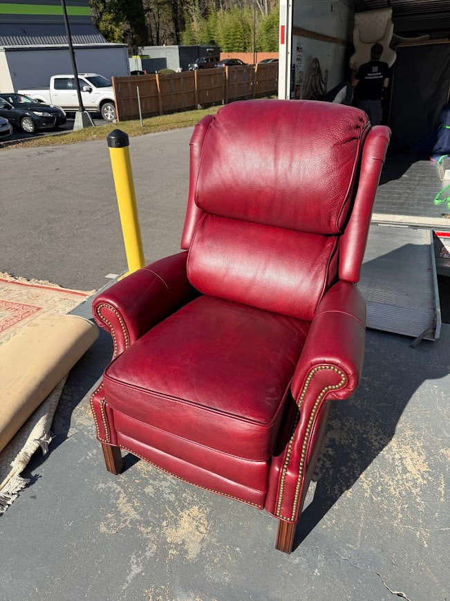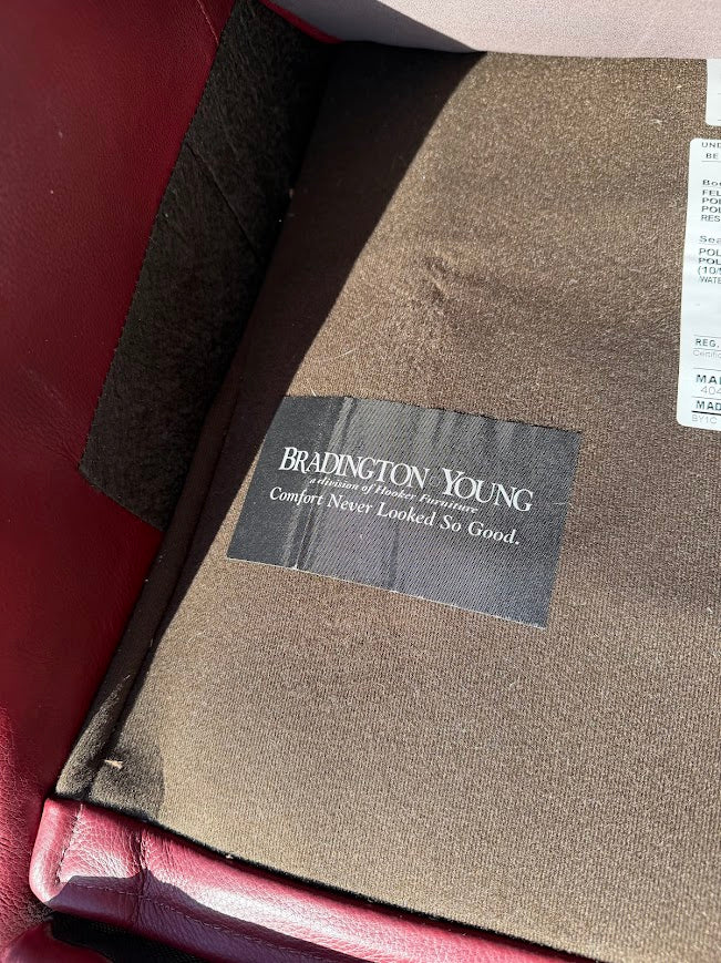 Luxurious in both comfort and presence, this Bradington-Young leather recliner offers the deep relaxation and craftsmanship the brand is known for. Wrapped in a rich, burgundy full-grain leather, it combines classic styling with plush support, creating a seating experience that feels indulgent and nearly new.