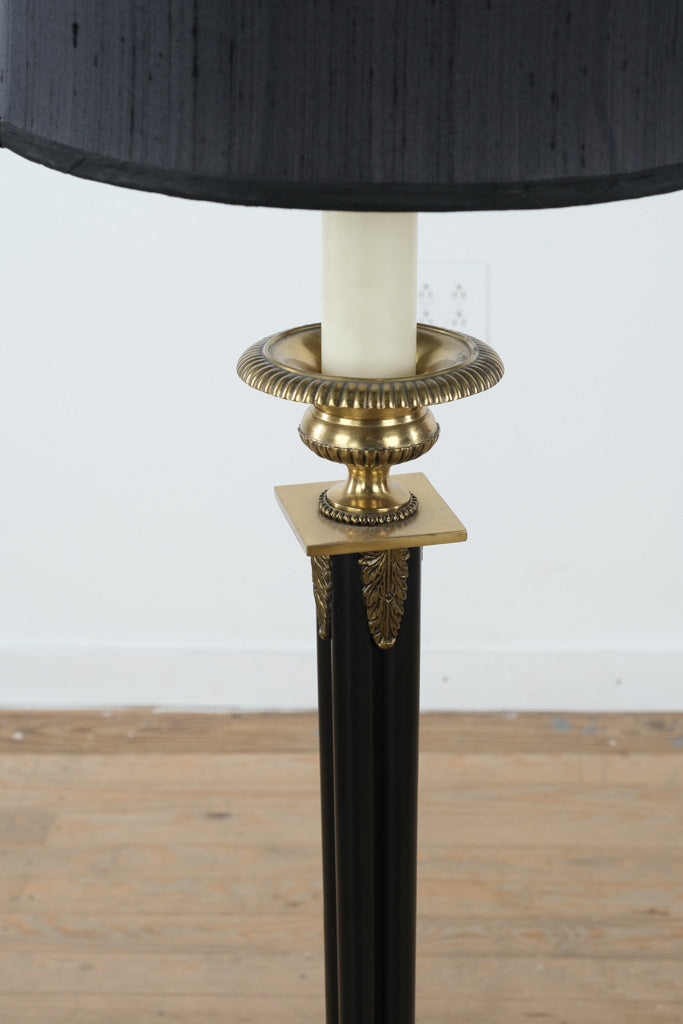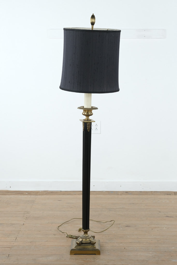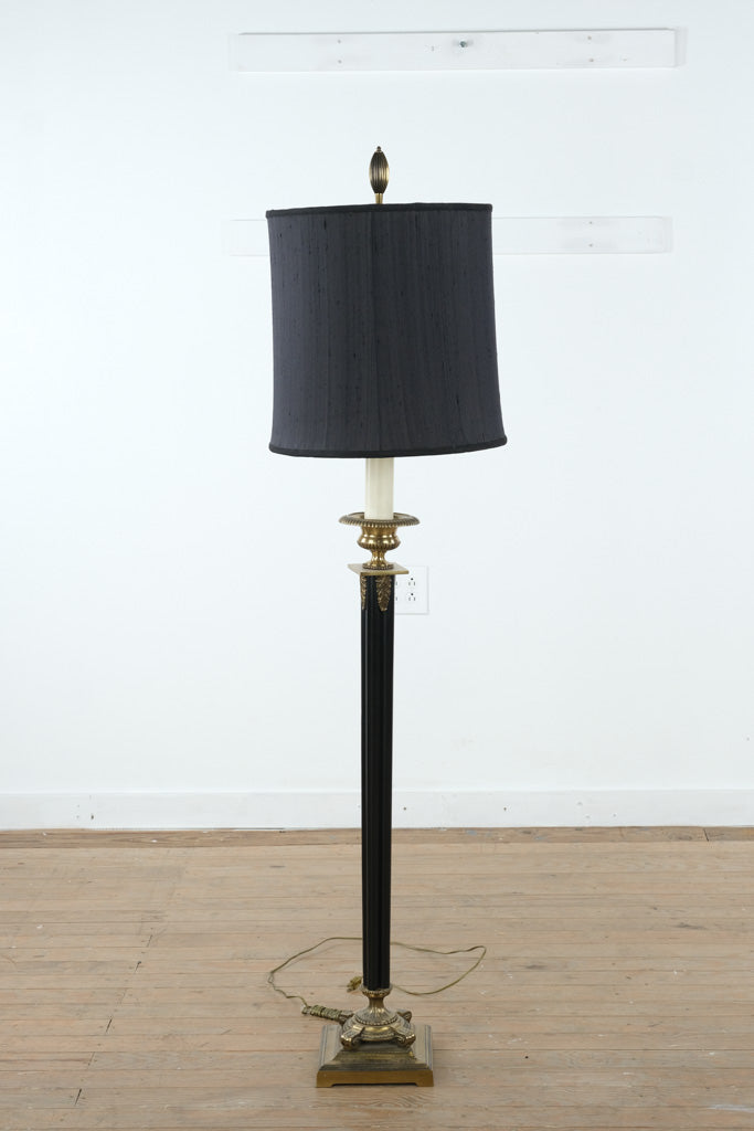 Bring timeless sophistication to your living space with this striking vintage floor lamp. Featuring a tall, fluted black column accented by ornate brass detailing and a sleek black drum shade, this lamp blends classic refinement with bold mid-century character. Ideal for a study, living room, or reading nook, it offers both ambient and task lighting with style that never goes out of fashion.