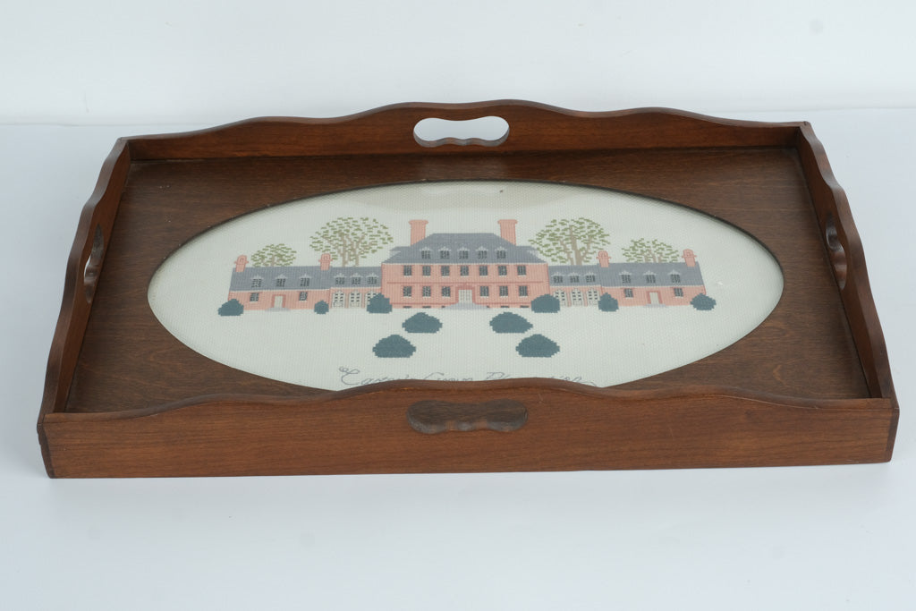 This beautifully crafted serving tray features a hand-stitched needlepoint of the historic Carter’s Grove Plantation, presented in a warm, traditional wooden frame. The detailed needlework highlights the elegant architecture of the plantation house, framed by soft greens and classic colonial tones. The oval center design gives the tray a refined, heritage-inspired look.