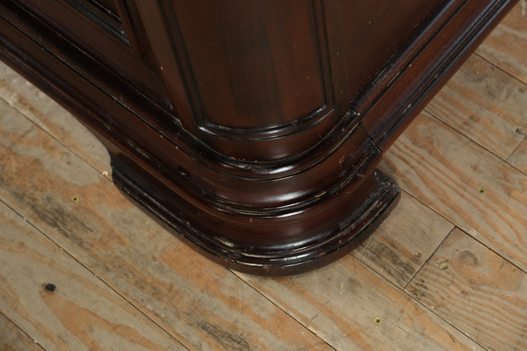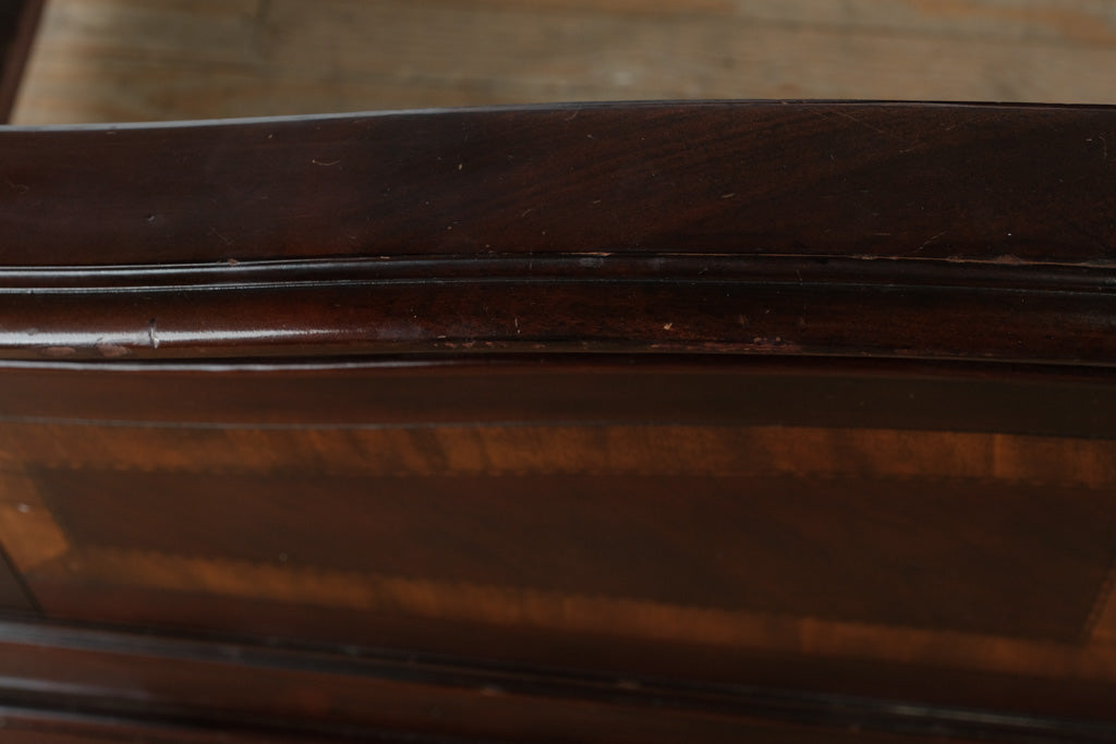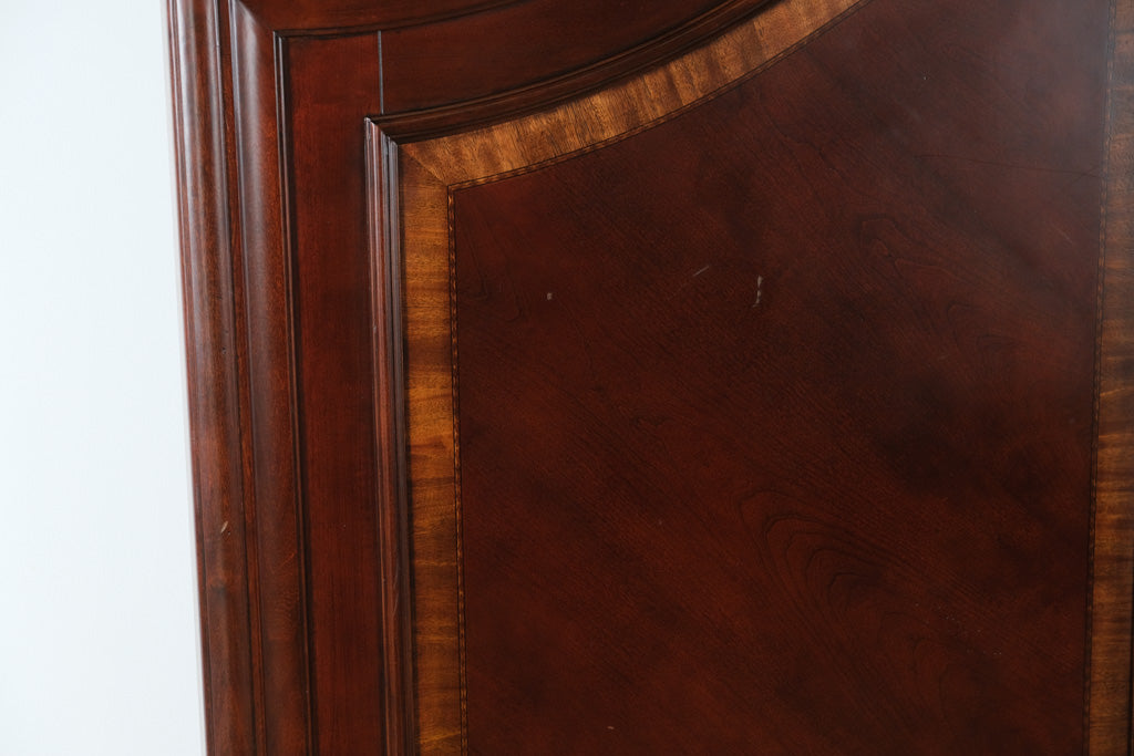 Meticulously constructed from solid cherry and select veneers, this queen bed highlights exceptional woodworking detail throughout. The decorative banded inlay accentuates the curvature of the headboard and footboard, while the deep hand-polished finish enhances the grain’s natural luster. Complete with sturdy side rails and bolts, the bed reflects both beauty and durability in its design.