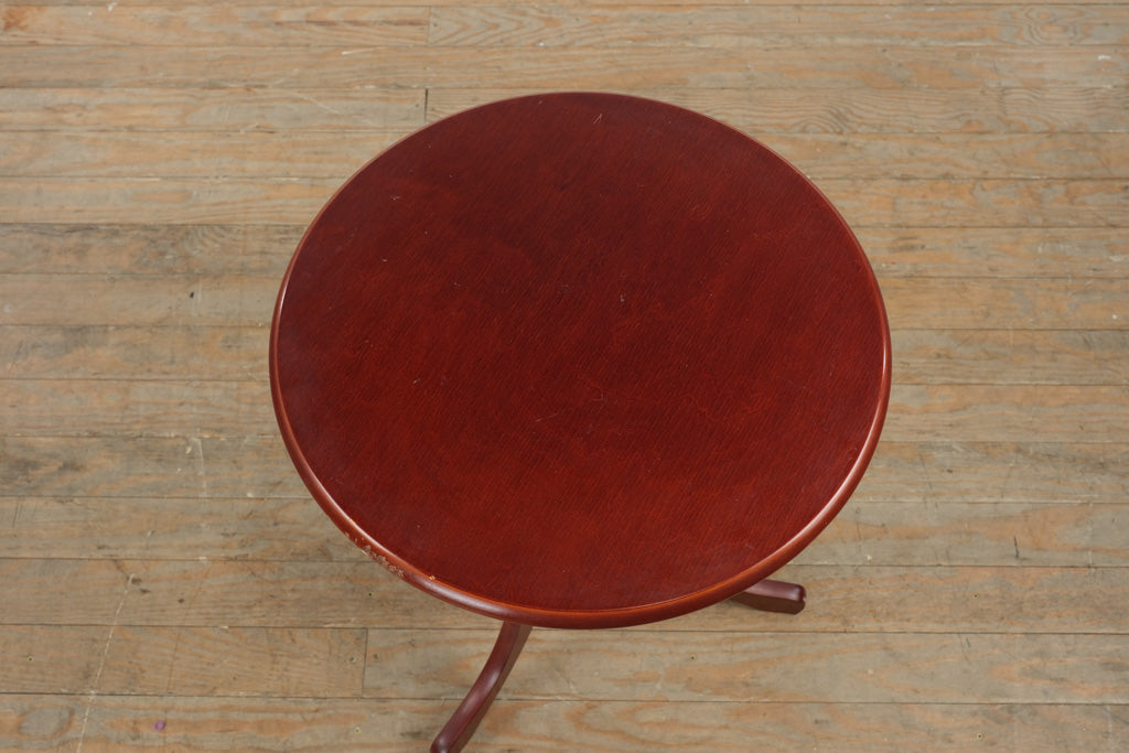 Crafted from solid wood and finished in a deep cherry stain, this table highlights the natural beauty of its grain. The turned pedestal base and tripod legs provide both visual elegance and structural stability, offering enduring craftsmanship and a refined look.