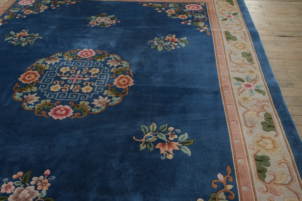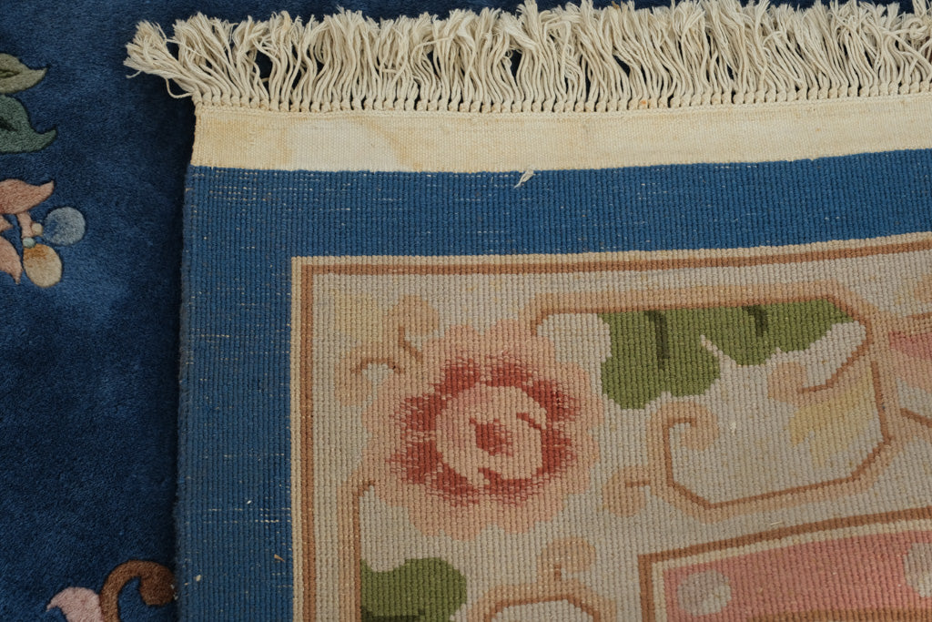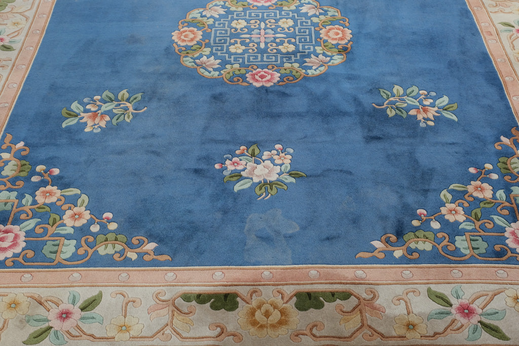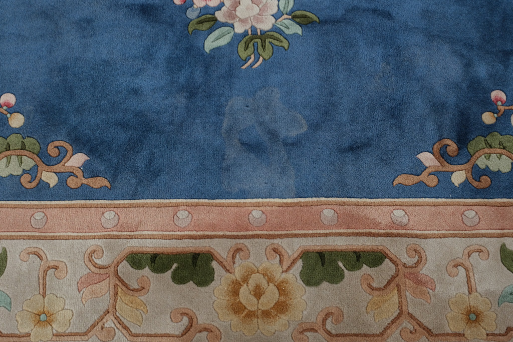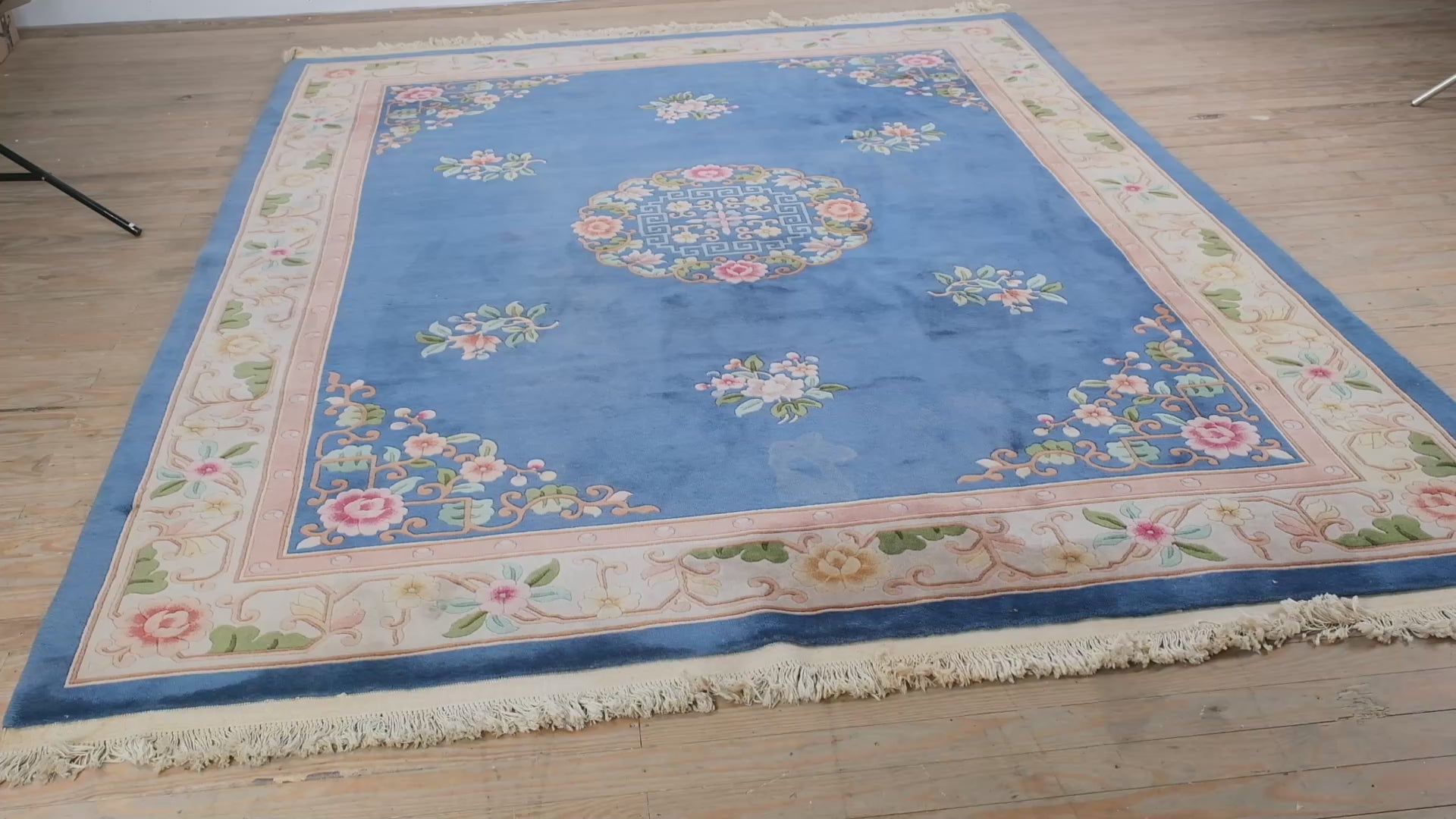 Expertly woven from 100% wool, this rug offers a plush, resilient pile and vibrant hand-dyed hues. The traditional Chinese floral border design is rendered with precision, highlighting fine craftsmanship and enduring quality. The rug’s dense weave and soft underfoot feel make it both luxurious and practical.