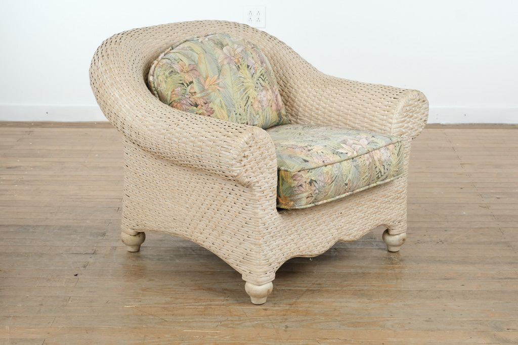 Bring airy coastal comfort into your home with this beautiful cream-colored woven wicker lounge chair and matching ottoman. With its oversized, rounded barrel-back silhouette, rolled arms, and sturdy all-woven frame, this set blends laid-back cottage charm with substantial, inviting design. The tropical botanical tapestry cushions feature soft greens, warm neutrals, and muted island-inspired tones—perfect for sunrooms, beach houses, patios (covered), or any space that needs a relaxed vacation feel.