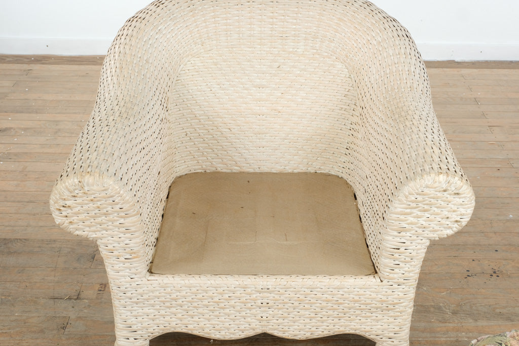 Cream-colored woven wicker frame with smooth curves and rolled arms