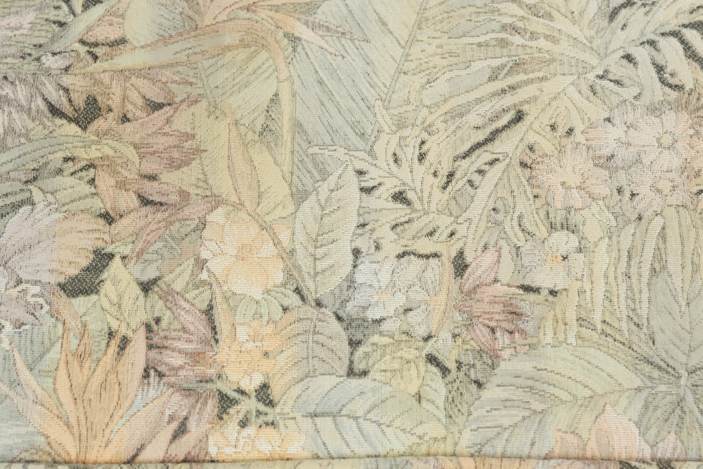 Tropical botanical tapestry cushions in soft greens, pinks, and sandy tones