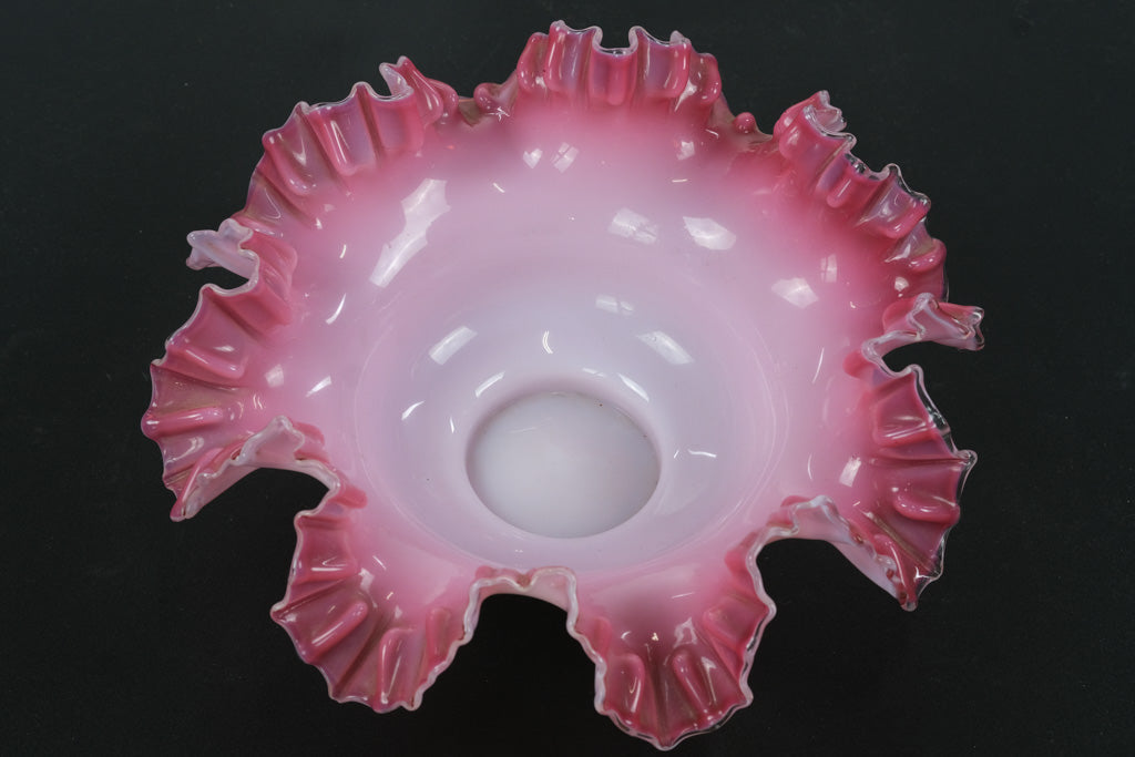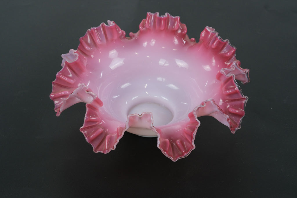 Perfect as a centerpiece, fruit bowl, or statement décor accent, this piece reflects the delicate craftsmanship often associated with Fenton and other fine American glassmakers. Its romantic color palette and fluid ruffled design make it a standout addition to vintage or modern interiors alike.
