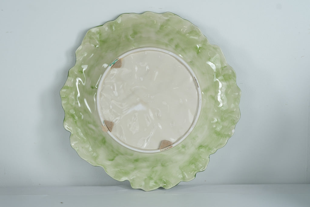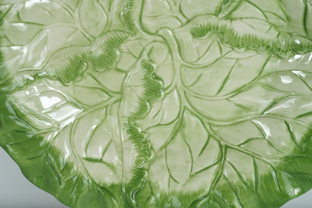 This Fitz and Floyd Cabbage Leaf Serving Platter is a beautiful statement piece that captures the brand’s signature blend of whimsy and elegance. Hand-painted in vibrant shades of green with detailed veining, this large 15-inch ceramic plate resembles a natural cabbage leaf, complete with a gently ruffled edge and glossy glaze finish.