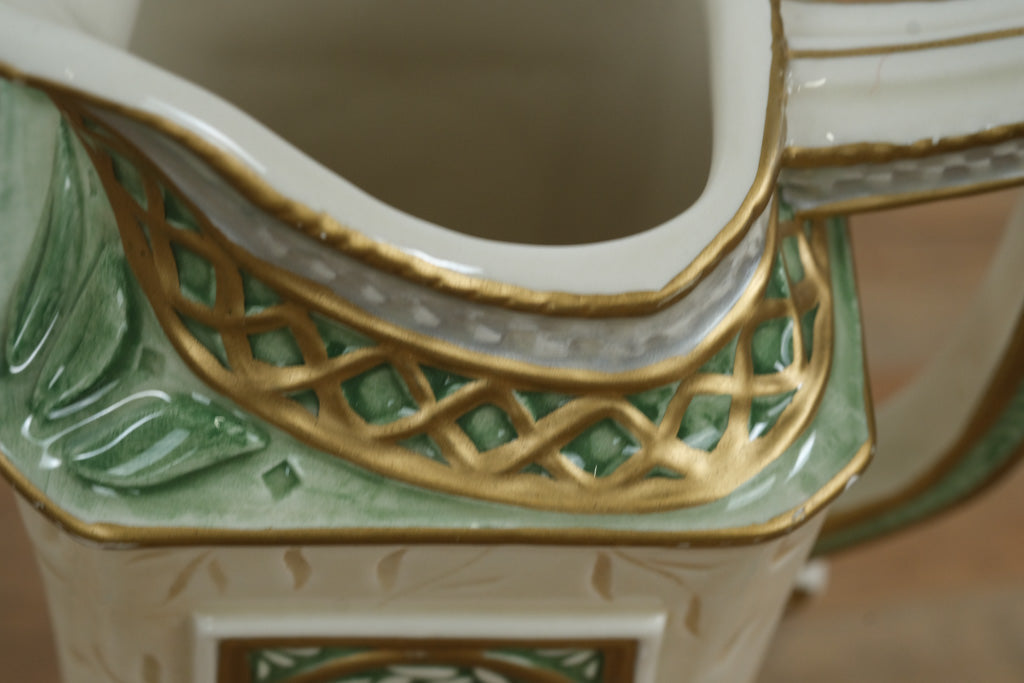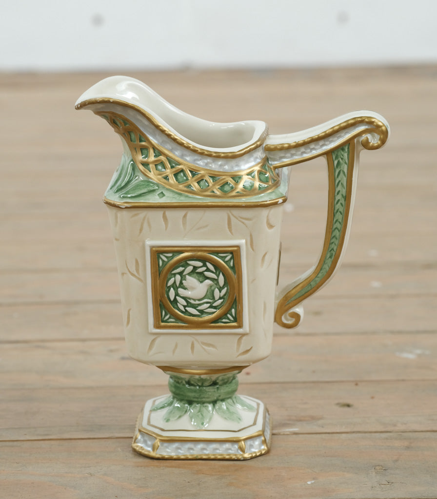 This exquisite Fitz and Floyd Gregorian Collection creamer captures the artistry and refinement that define the brand’s timeless Classics line. Handcrafted and beautifully detailed, the piece features embossed leaf motifs and doves framed in elegant green and gold accents over an ivory background. With its sculpted handle and pedestal base, this 5 5/8-inch creamer is both functional and decorative — perfect for serving or display. Produced between 2000 and 2022, it exemplifies Fitz and Floyd’s tradition of sophisticated ceramic craftsmanship.