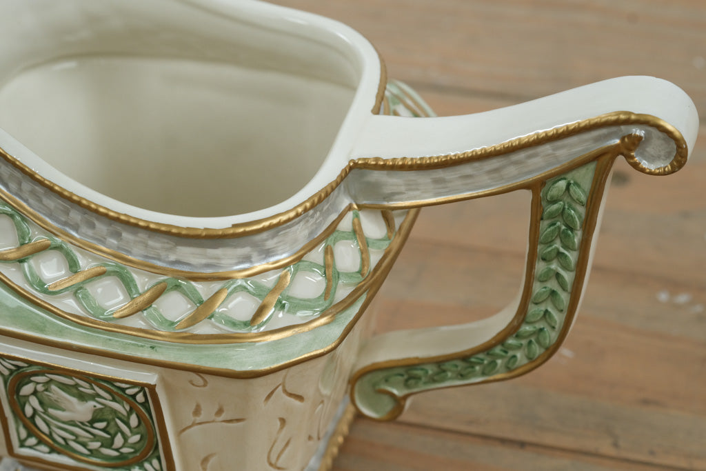 This elegant Fitz and Floyd Gregorian Collection gravy boat exemplifies the brand’s dedication to fine craftsmanship and timeless design. Handcrafted from porcelain, it features embossed leaf and dove motifs framed by hand-painted green and gold accents on a soft ivory background. The graceful handle and footed base lend classic formality to your table setting, making it perfect for serving gravies, sauces, or dressings with sophistication. Produced as part of the beloved Fitz and Floyd Classics line, this piece beautifully complements other items from the Gregorian Collection.