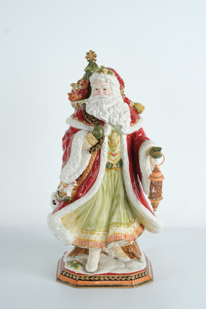 This exquisite Fitz and Floyd Damask Holiday Santa Centerpiece (model 19-616) captures the warmth and magic of the season with remarkable craftsmanship and vibrant, hand-painted details. Santa stands regally in a sweeping damask-inspired robe, holding a delicately sculpted lantern and carrying a festive evergreen tree adorned with gifts and a charming teddy bear. Every fold of his robe, each painted flourish, and the rich holiday palette showcase Fitz and Floyd’s signature artistry.