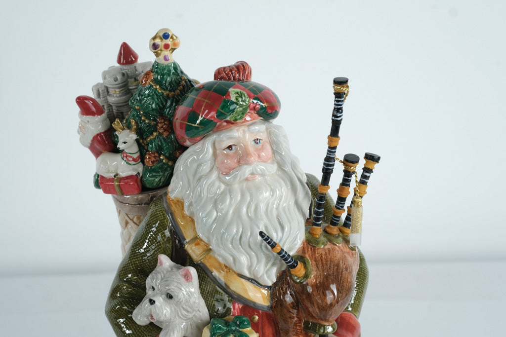 Celebrate the season with this richly detailed Fitz and Floyd Scottish Highlands Santa from the Highland Holiday collection. Model 19/2051 (2006 release), this magnificent figurine captures Santa dressed in traditional Scottish tartan, complete with kilt, sporran, and bagpipes. Surrounded by festive touches—from the loyal Westie dog at his feet to the toy-filled basket on his back—this piece brings charm, heritage, and holiday cheer together in a single striking display.