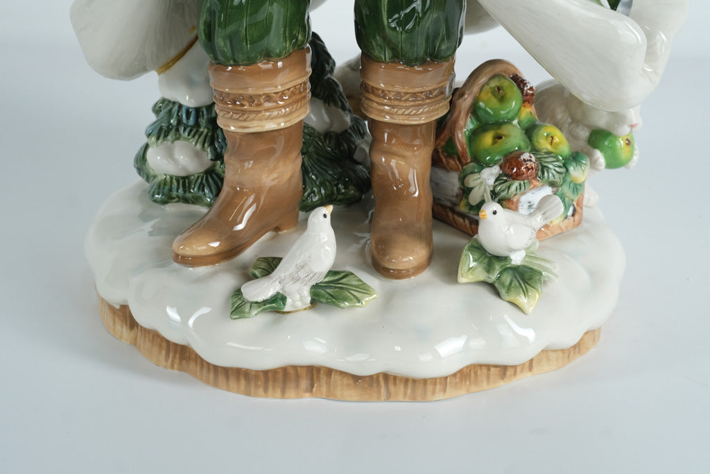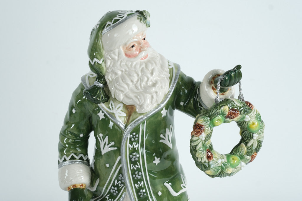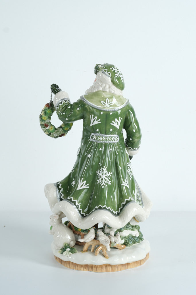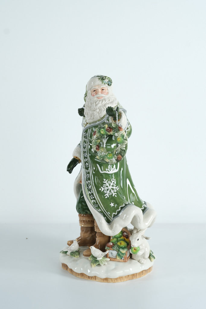 Celebrate the serenity and charm of the winter season with the Fitz and Floyd Winter Garden Santa Figurine. Dressed in a beautifully detailed green coat with white snowflake motifs, this Santa brings a peaceful woodland aesthetic to your holiday décor. He holds a lush wreath adorned with apples, pinecones, and winter greenery, while gentle doves and woodland animals gather at his feet beside a basket of fruit.