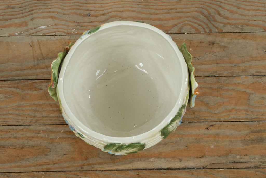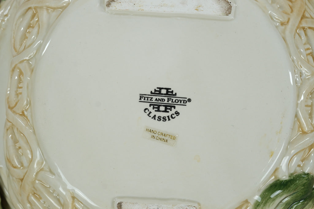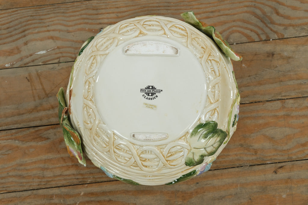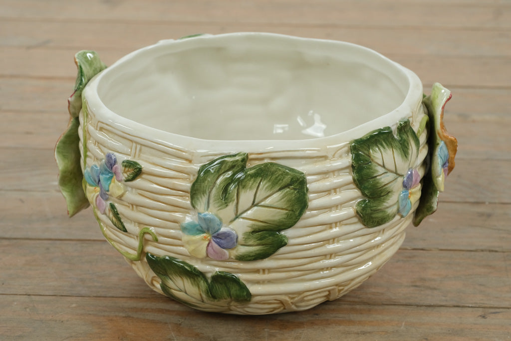 This beautifully detailed Fitz & Floyd Classics “Old World Rabbits” cachepot embodies the timeless artistry the brand is known for. Handcrafted and hand-painted, it features a charming basket-weave texture adorned with vibrant morning glory flowers and richly colored ivy leaves. The subtle ivory glaze brings out the intricate relief work, making this piece perfect as a centerpiece, planter, or decorative accent for any room. Whether displayed alone or used to hold florals, it adds a touch of classic Fitz & Floyd elegance to your collection.