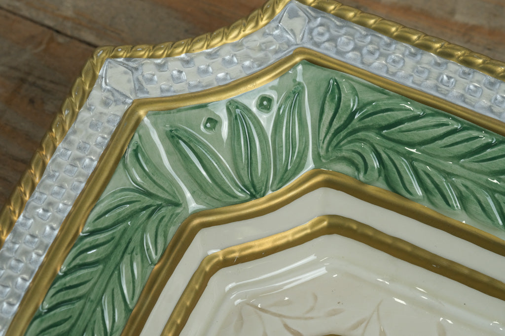 Bring timeless sophistication to your home décor with this handcrafted Fitz & Floyd Home Fragrance Collection decorative tray. Measuring approximately 11 inches square, this elegant ceramic piece showcases embossed leaf patterns in soft cream tones, bordered by hand-painted green and gold accents. The textured silver-tone edge adds depth and refinement, making it an ideal accent tray for potpourri, candles, or display.