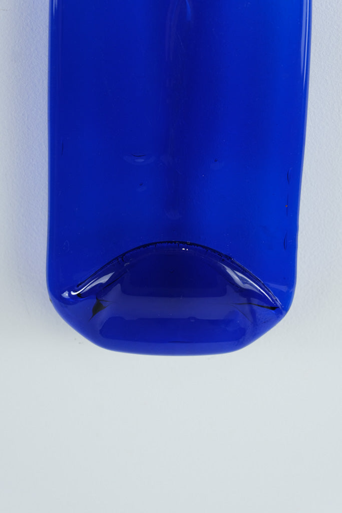 This eye-catching cobalt blue glass wall hanging began life as a bottle and was artistically flattened to create a unique piece of upcycled art. The brilliant sapphire hue catches and reflects light beautifully, adding a pop of color to any kitchen, bar area, or window display. Finished with a metal hanging loop at the top for easy display, this decorative bottle also works wonderfully as a cheese board, spoon rest, or simply a sculptural accent.