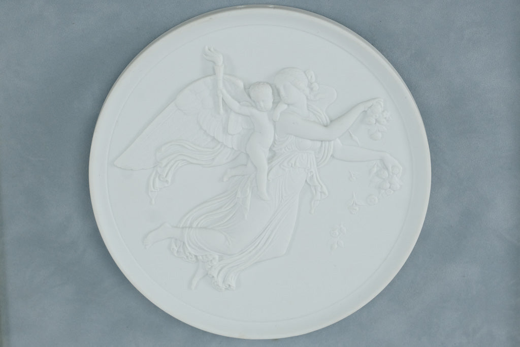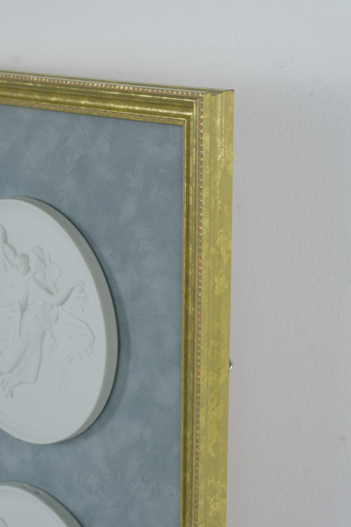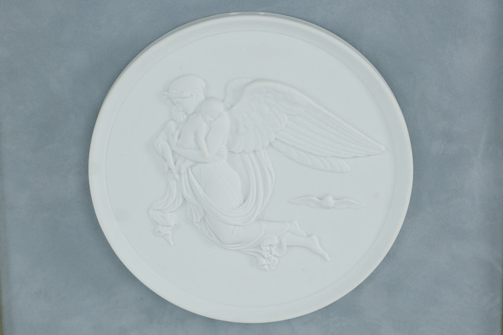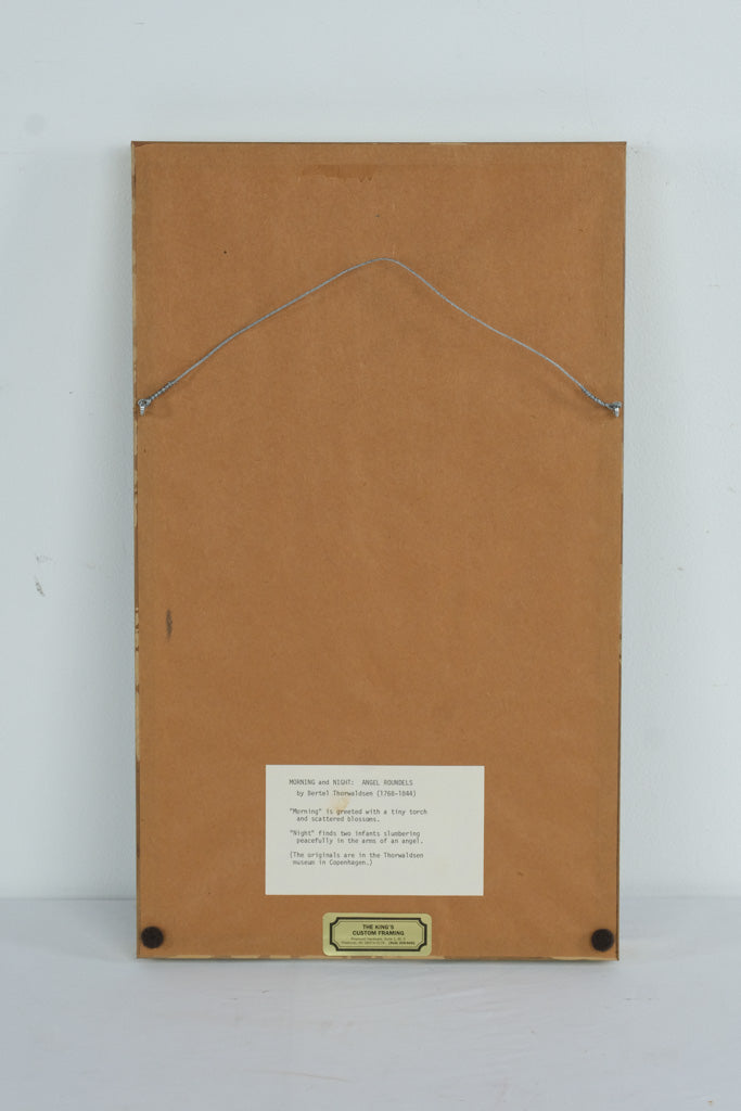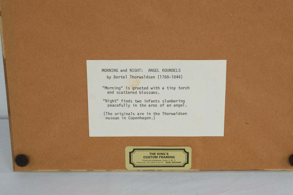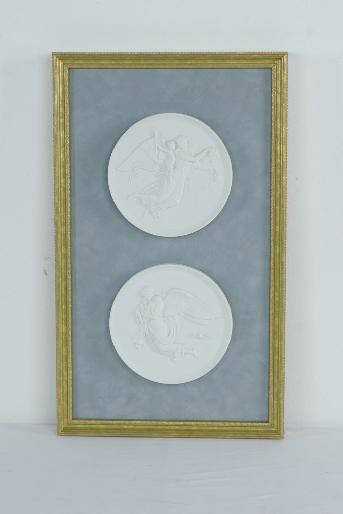 This framed decorative artwork features two circular white bas-relief plaques depicting allegorical angel scenes based on Thorvaldsen’s famous compositions: