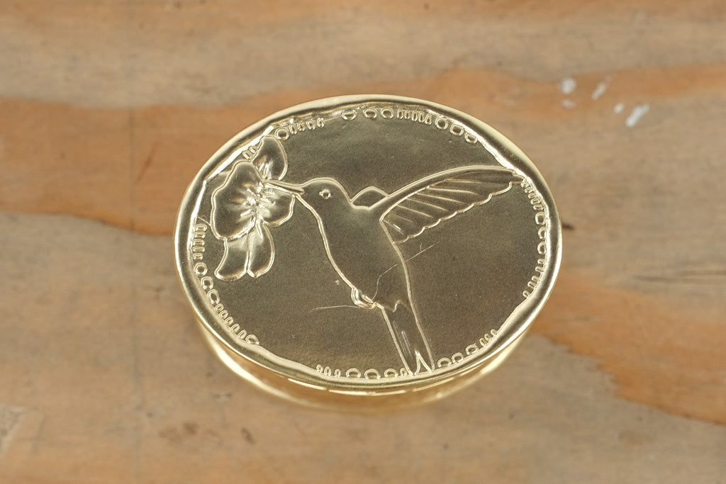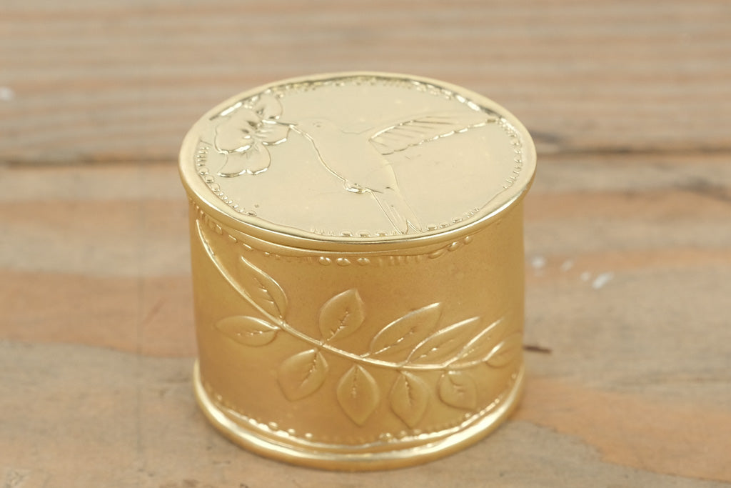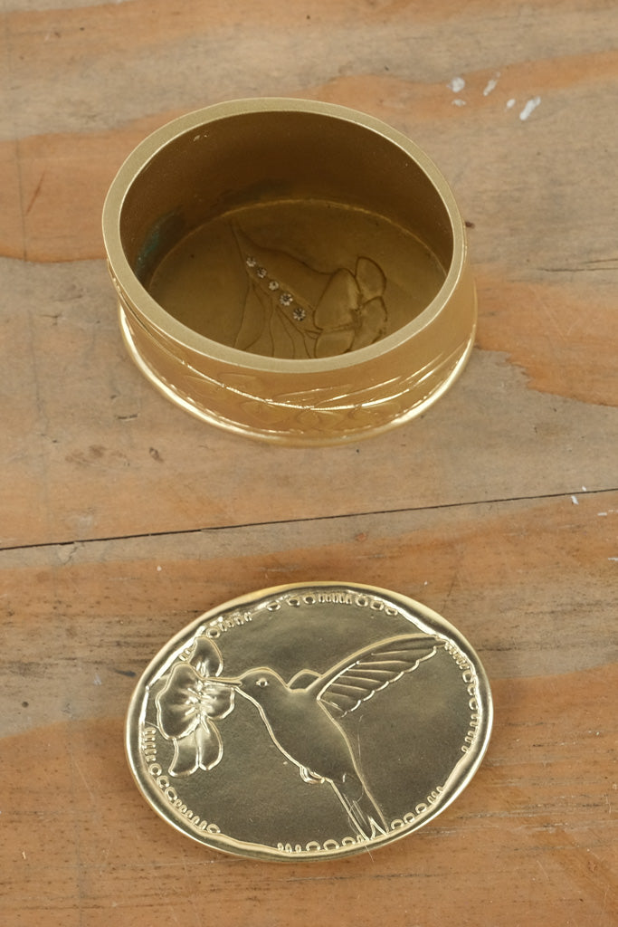 Embossed gold-tone trinket box with hummingbird and floral motif