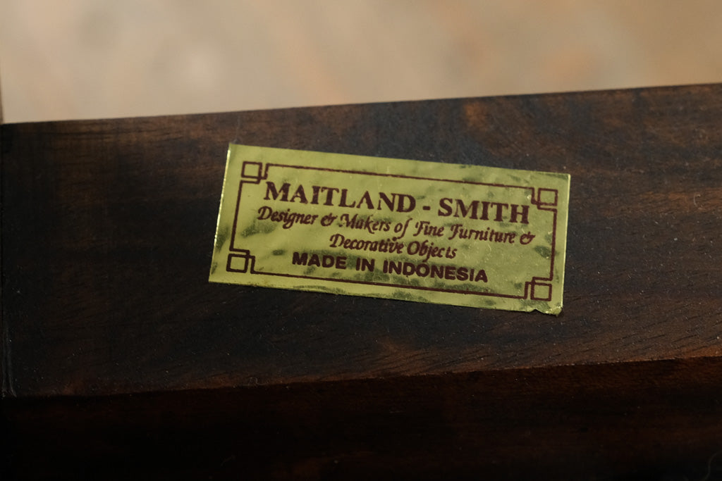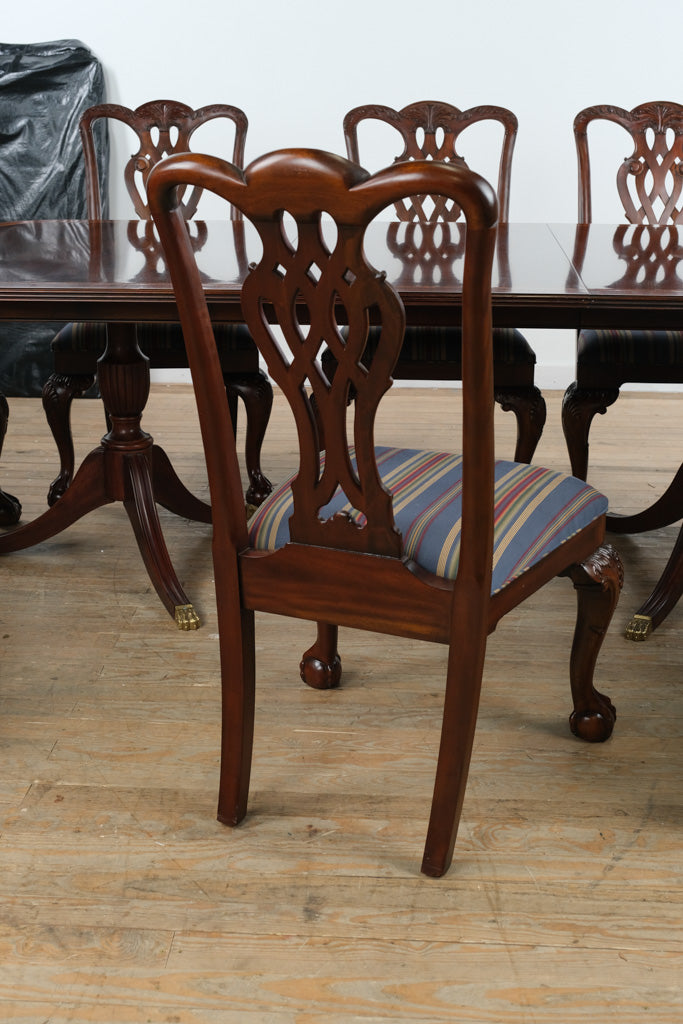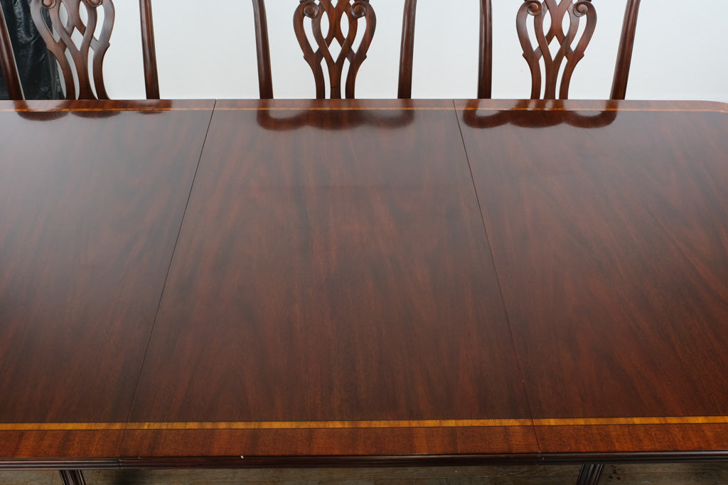 A breathtaking blend of heirloom craftsmanship and timeless formal elegance, this Henkel Harris mahogany double-pedestal dining table paired with eight Maitland-Smith chairs offers a truly distinguished presence. The set showcases rich mahogany tones, an impeccably preserved banded tabletop, and exquisitely carved chair framesâcoming together as a rare opportunity to own two revered, top-tier furniture makers in one complete ensemble.