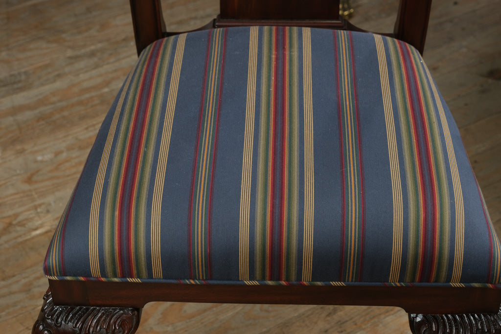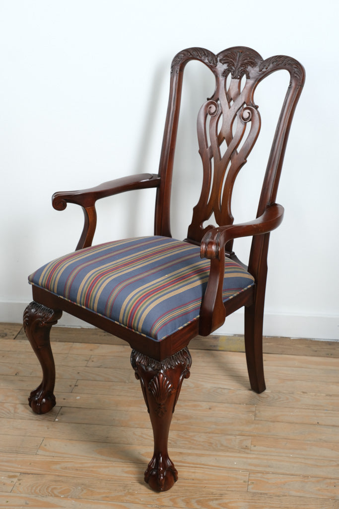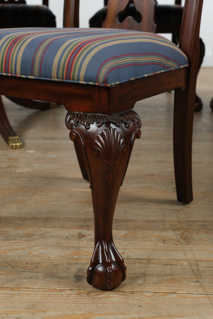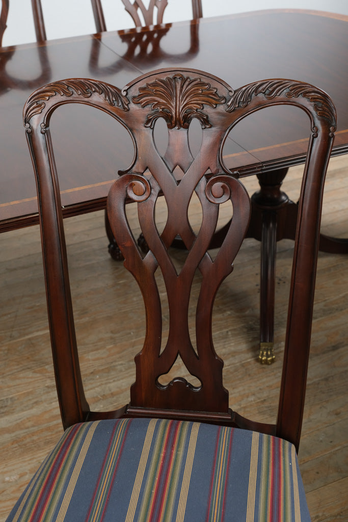 The Maitland-Smith chairs complement the table perfectly with deeply carved backs, substantial weight, carved cabriole legs, and richly upholstered striped seats. Each piece reflects meticulous hand-finishing and the integrity expected from two of the most respected American furniture houses.