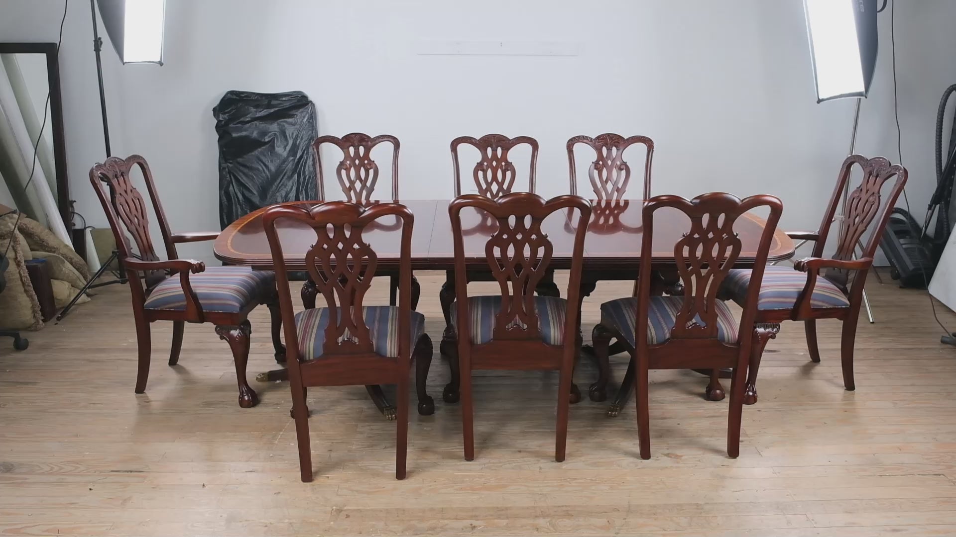 This ensemble brings stately presence to a dining room, executive space, or grand entertaining area. The combination of carved detailing, rich upholstery, and classic double-pedestal styling offers both visual impact and enduring sophisticationâperfect for family gatherings, holiday entertaining, or designing a polished, traditional interior that will age gracefully for decades.