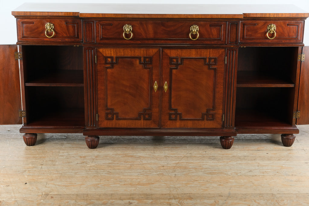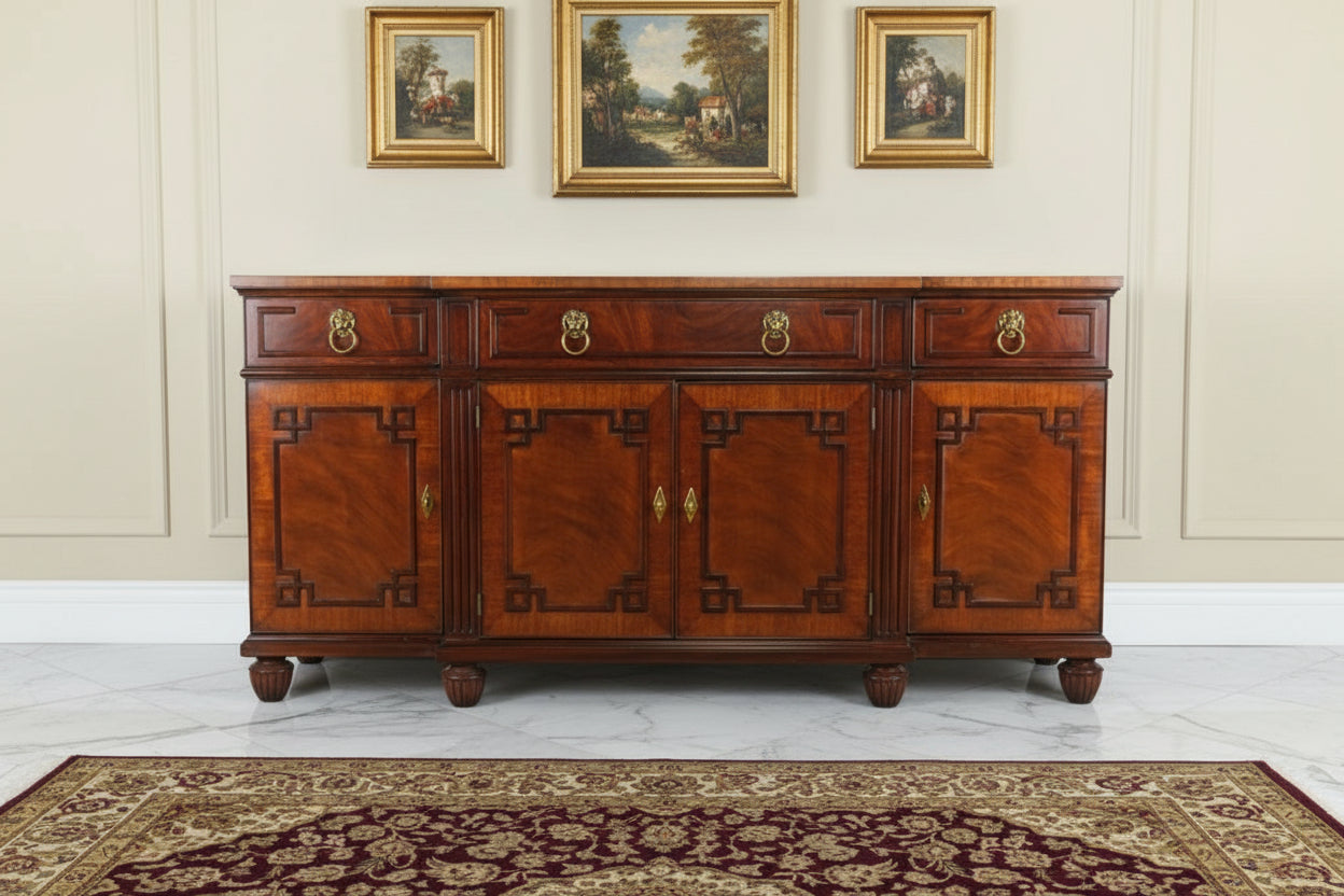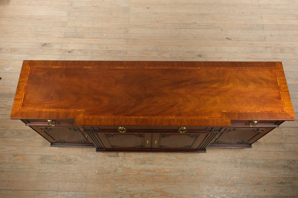 Expertly crafted in Winchester, Virginia, this buffet reflects the superior standards Henkel Harris is renowned for. The flamed mahogany veneers display striking movement and depth, complemented by precise inlay work across the top. Classic Regency-style paneling and carved geometric door frames add architectural interest, while brass lion’s-head ring pulls lend a stately, traditional touch. The drawers are beautifully dovetailed in solid oak, gliding smoothly with the weight and stability expected from one of America’s premier furniture makers.