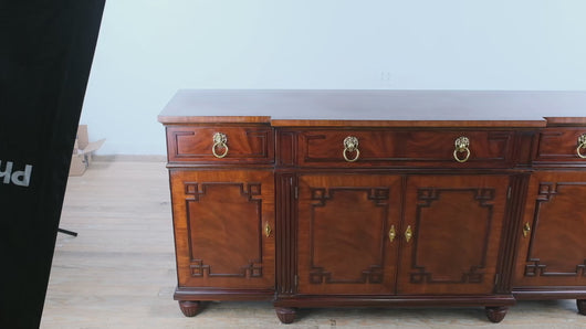 Gracefully blending Regency influence with the unmistakable refinement of Henkel Harris craftsmanship, this flamed mahogany buffet offers a commanding presence—its rich grain, satin sheen, and sculptural detailing creating a true heirloom focal point for any dining or living space.