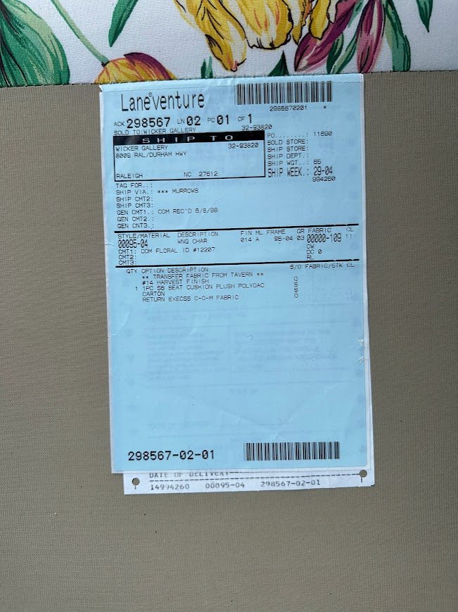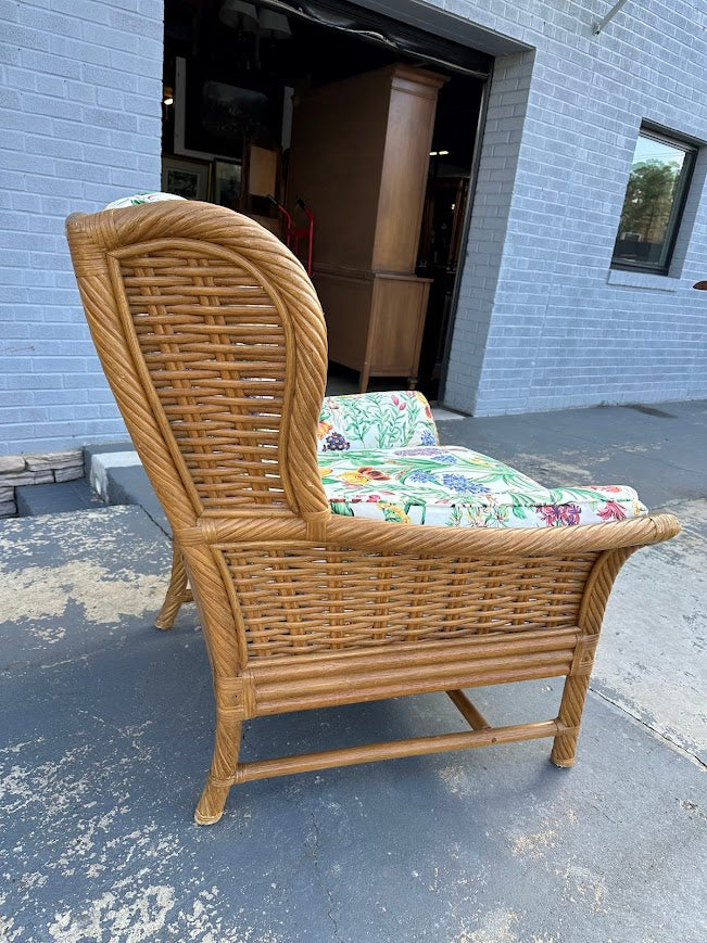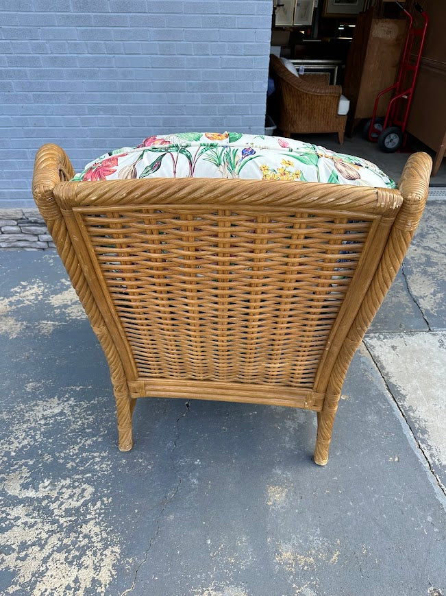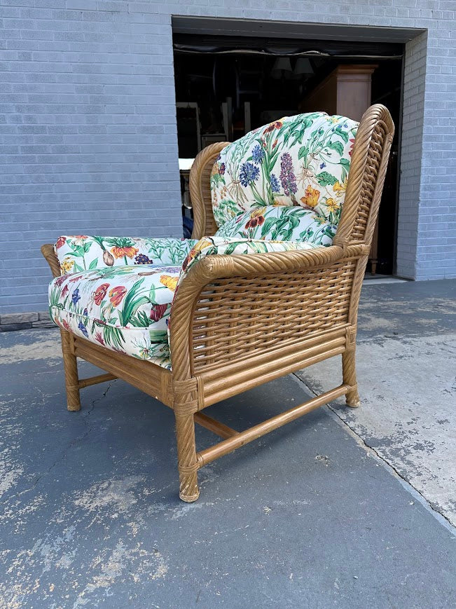 Expertly built by Lane Venture, this chair showcases a sturdy rattan frame with finely wrapped and woven detailing. The cushions feature a high-quality floral upholstery in rich, saturated colors that highlight the brand’s reputation for comfort and durability. Thick, supportive padding and tailored seams ensure lasting shape and everyday usability.