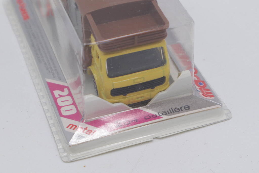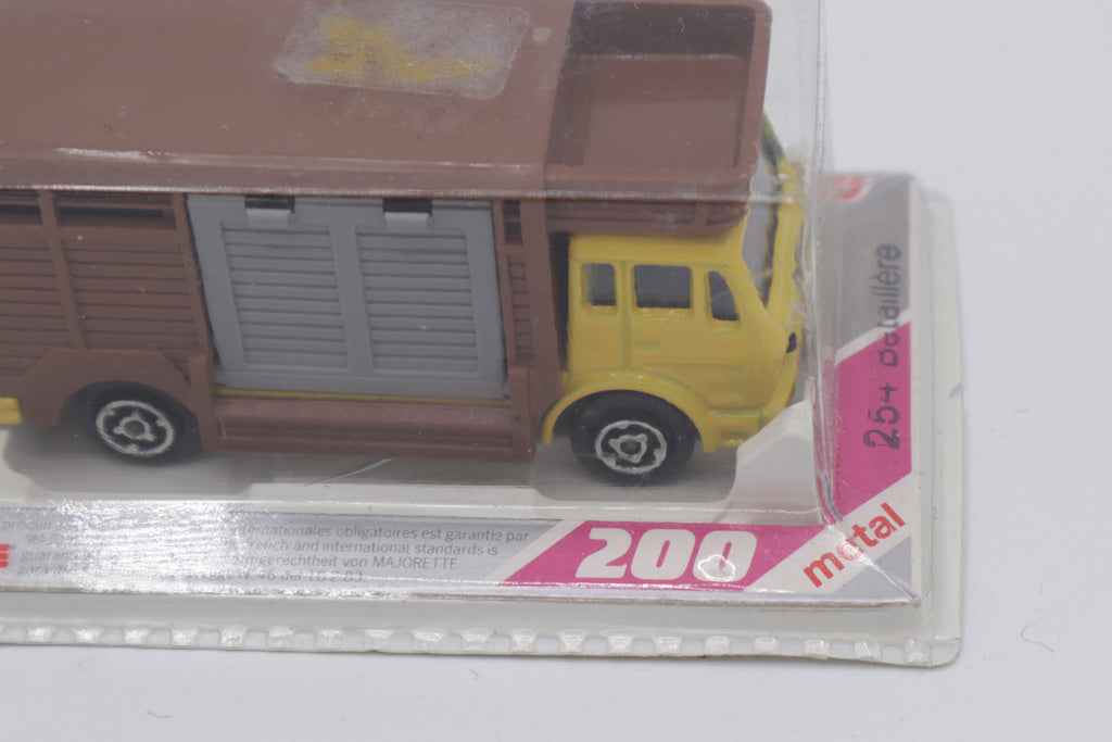 This vintage Majorette No. 200 Béttailère livestock transport truck is a diecast model finished in brown with a yellow cab and gray sliding side doors. Still sealed in its original packaging, this piece is an excellent example of Majorette’s 1980s–1990s production quality.
