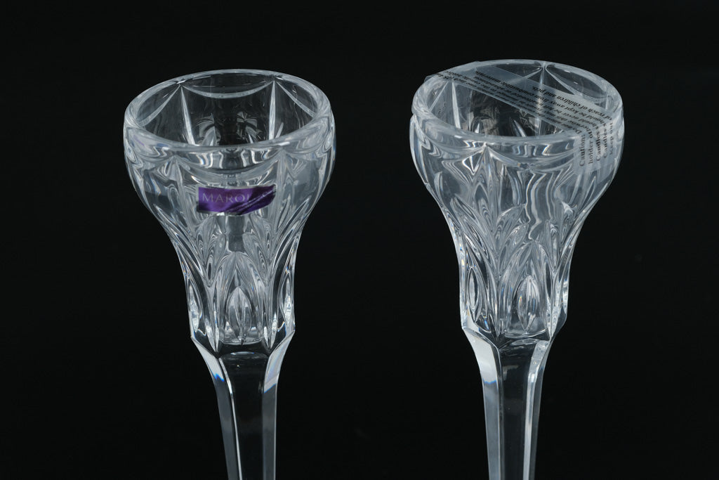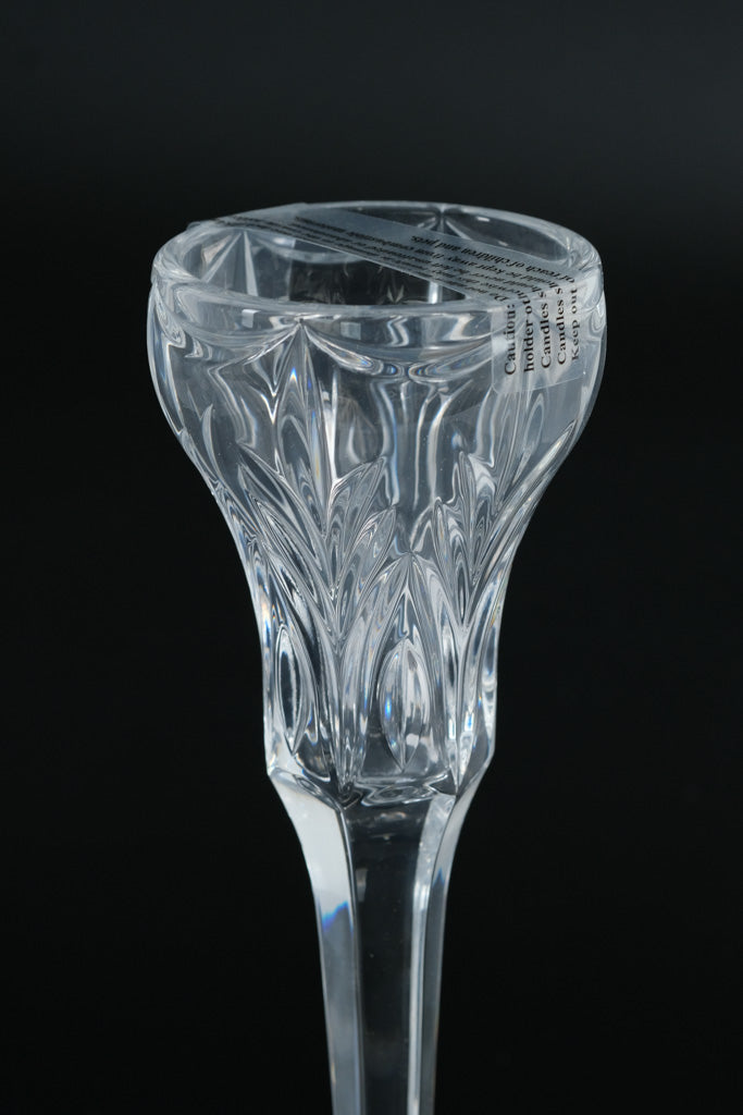 Excellent – Both candlesticks appear unused with clear, brilliant crystal and no visible wear. Box shows light shelf wear consistent with storage.