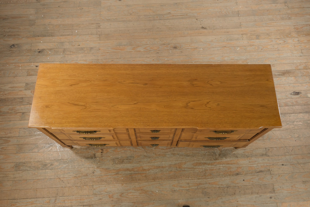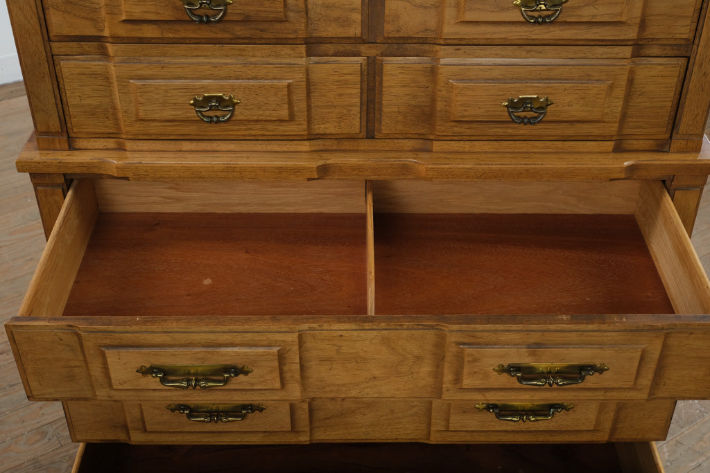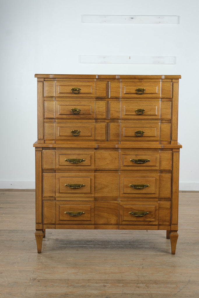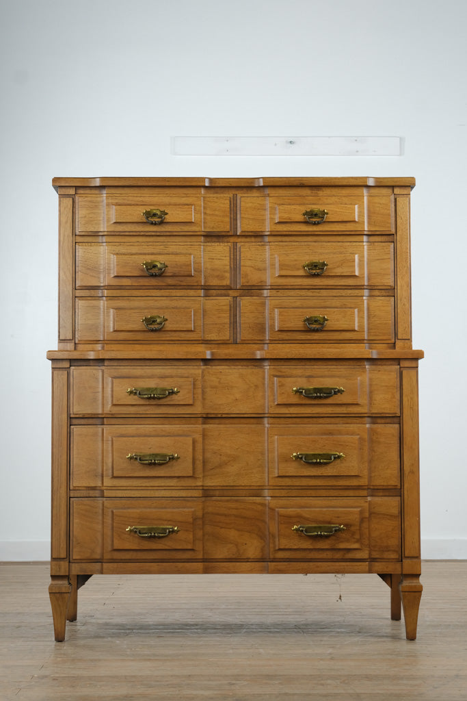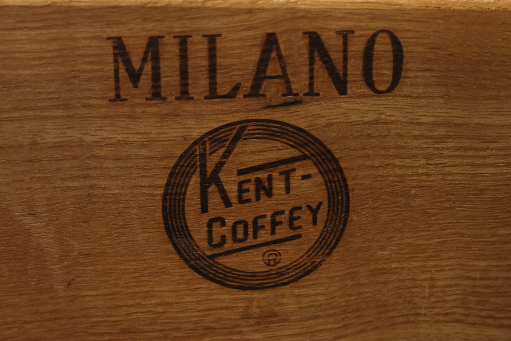 Constructed from solid wood and select veneers, this chest exemplifies Kent Coffey’s renowned mid-century craftsmanship. The recessed panel drawer fronts, original brass pulls, and smooth finish highlight the Milano Collection’s distinctive architectural styling and precision joinery.