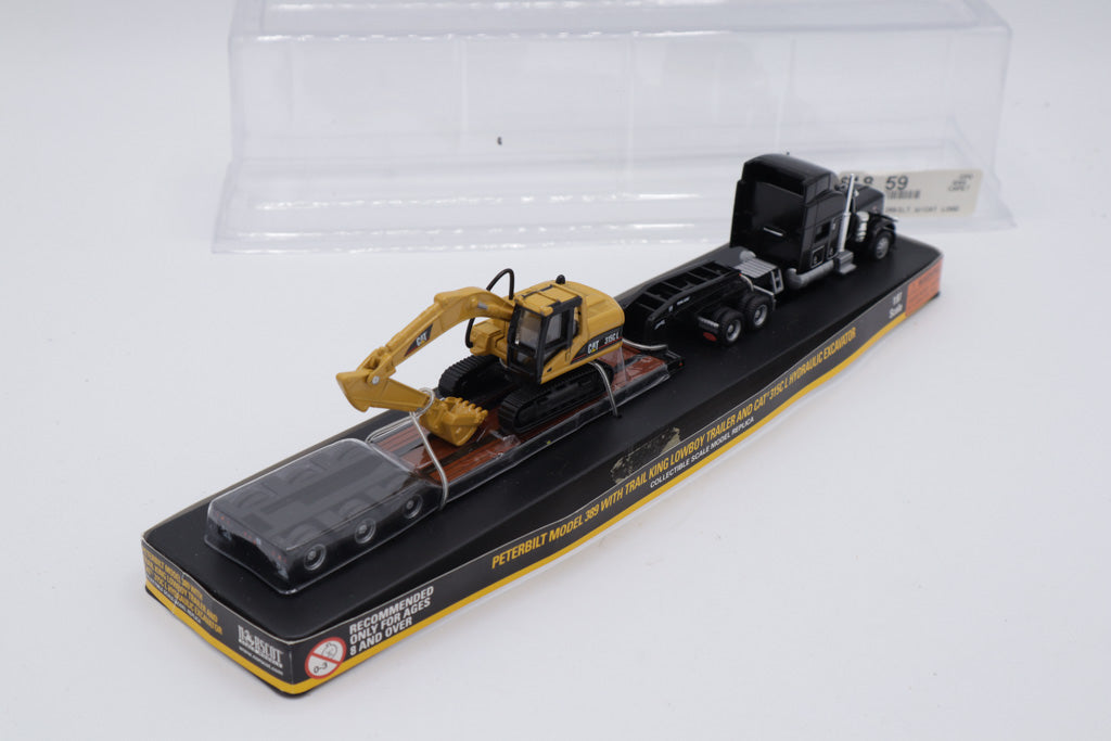 This collectible 1:87 scale die-cast set by Norscot features a Peterbilt Model 389 tractor with Trail King Lowboy trailer, hauling a CAT 315CL hydraulic excavator. Produced with excellent detail, this model highlights working construction equipment and heavy hauling in miniature.