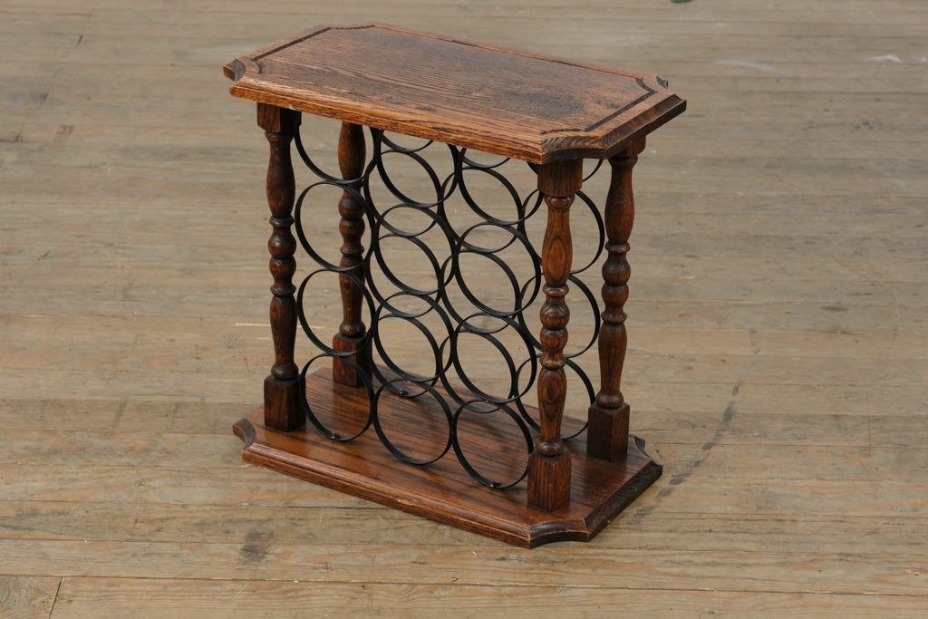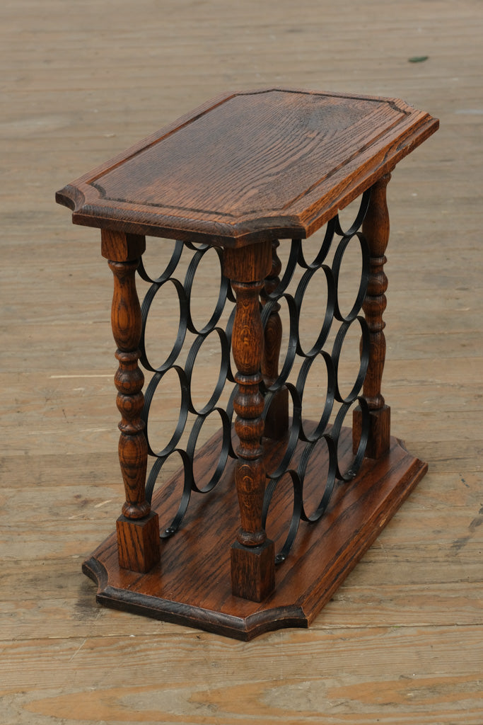 Solid oak construction with turned wood legs and a decorative top featuring carved details. Holds 12 standard bottles with sturdy iron rings. The top surface doubles as a small serving or display table.
