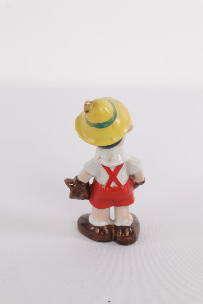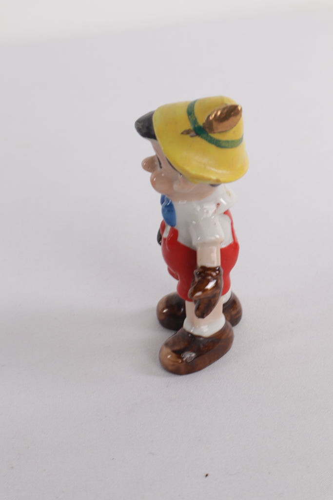 This charming vintage porcelain figurine was made in Occupied Japan (1945–1952) and depicts a Pinocchio-style boy with bright colors and a playful stance. Dressed in red suspenders, blue bow tie, yellow feathered hat, and oversized brown shoes, the figure captures the whimsical character of mid-20th-century Japanese export ceramics.