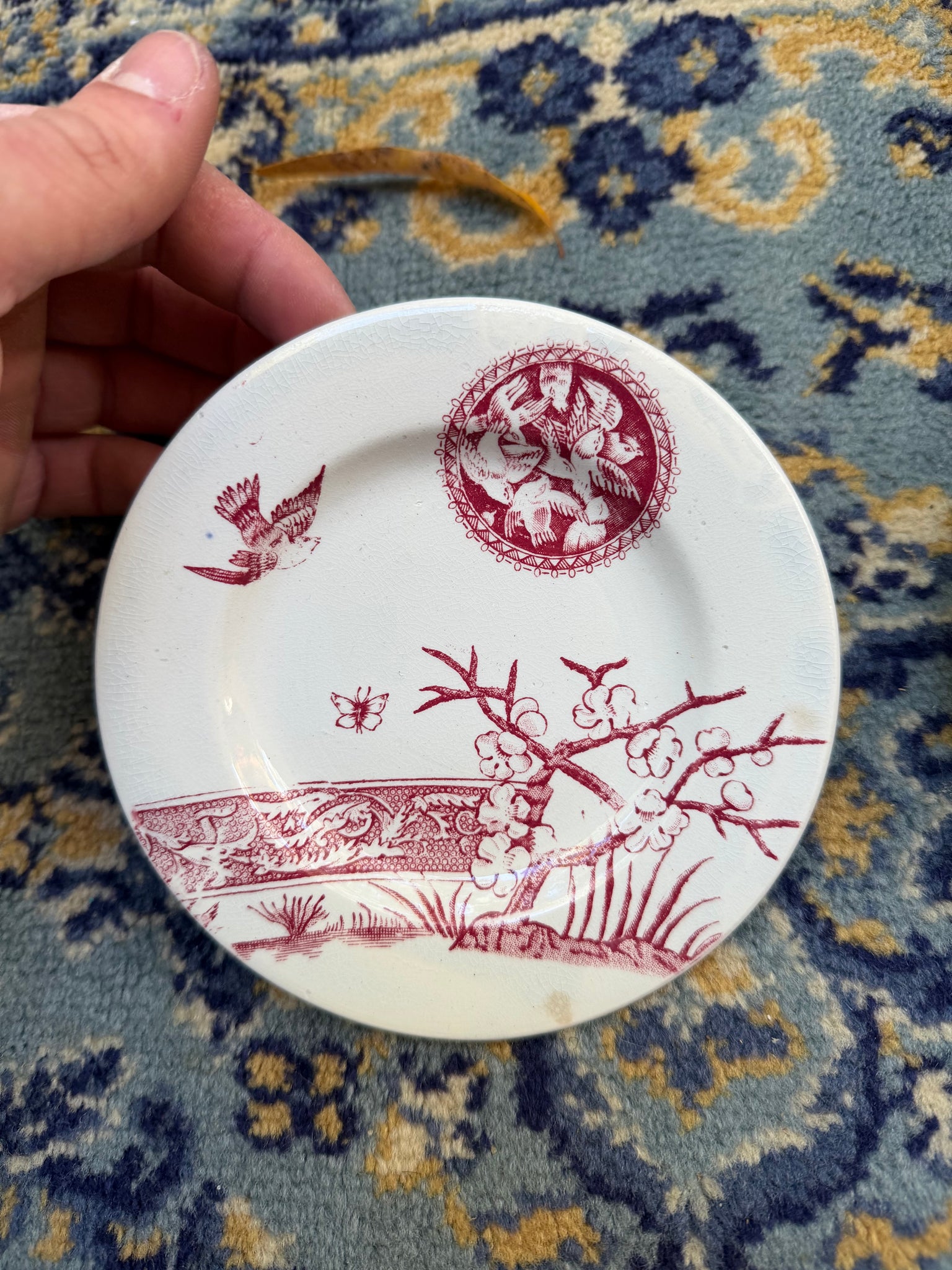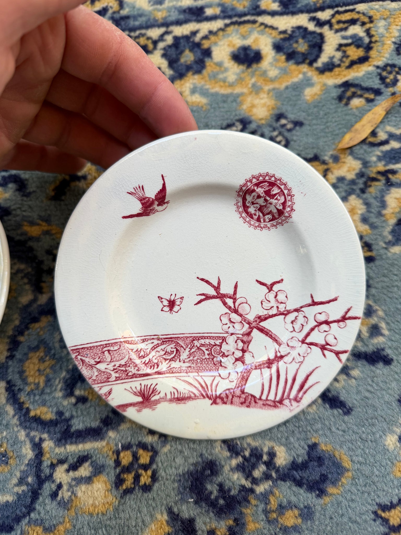 A lovely pair of antique red transferware saucers from the late 19th century, each beautifully decorated with birds in flight, butterflies, and flowering branches in the distinctive Aesthetic Movement style. The intricate red transfer design combines naturalistic imagery with ornamental scroll borders—an homage to the East-meets-West artistry that defined the era’s pottery.