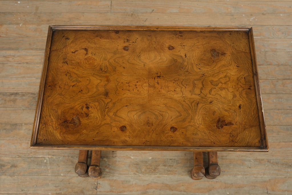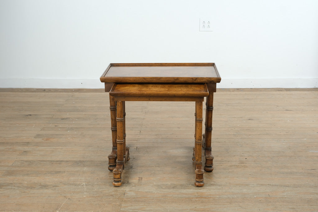 Expertly crafted from solid wood with a burled walnut veneer, these tables display intricate grain patterns and a finely molded edge. Each rests on sculptural turned legs connected by stretcher bases, ensuring both strength and visual harmony. Drexel Heritage’s attention to finish and proportion shines through in every detail, from the smooth glides of the nesting track to the rich patina of the hand-applied varnish.