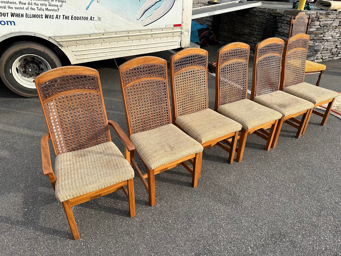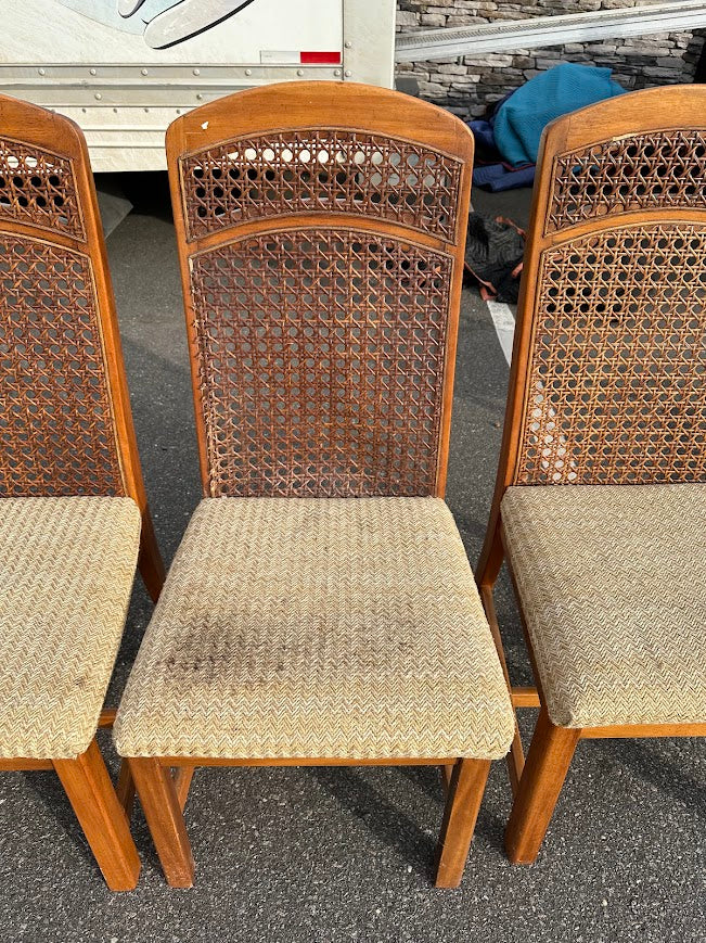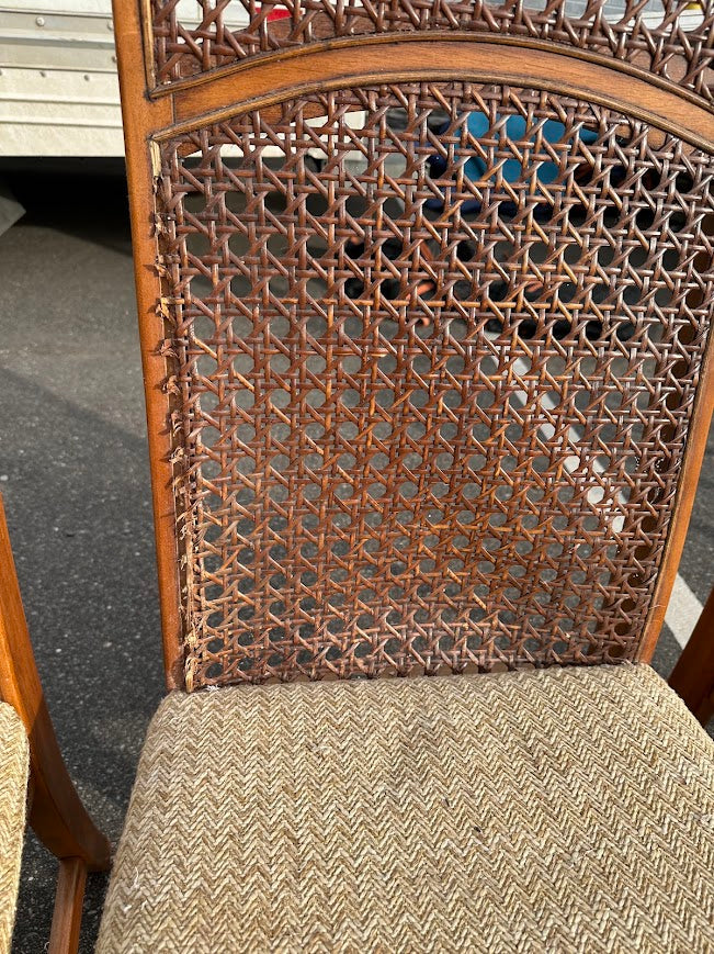 Blending warm wood tones with classic woven-cane detailing, this vintage dining set brings timeless character and inviting texture to any dining space. The parquet-style tabletop adds visual depth and craftsmanship, while the high-back chairs create a welcoming, traditional silhouette perfect for family gatherings or everyday meals.