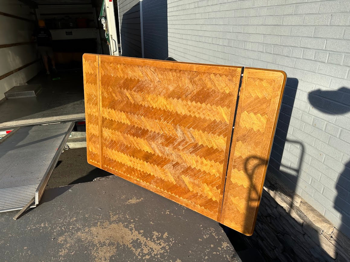 Solid wood dining table with a beautiful parquet/herringbone veneer top.