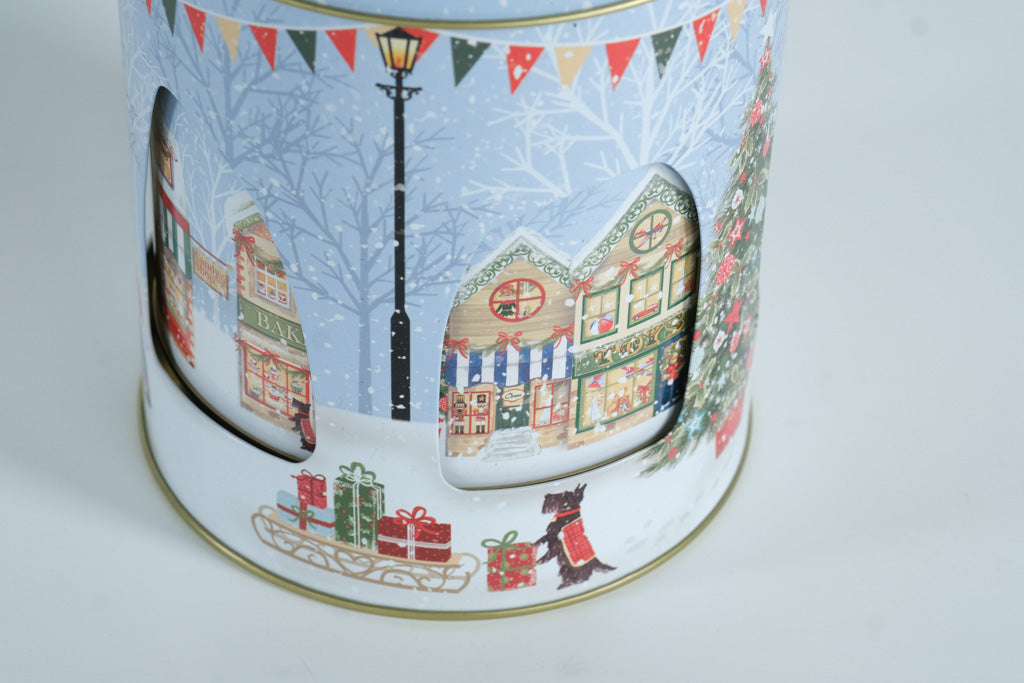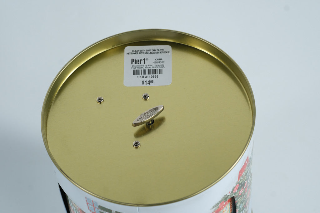 Bring festive charm to your holiday décor with this delightful Pier 1 Imports Musical Christmas Tin. Featuring a nostalgic winter village scene complete with shops, snow-covered trees, cheerful snowmen, and colorful gift displays, this tin adds warmth and whimsy to any room. The cut-out windows reveal a rotating interior scene when the music plays, offering a cozy, old-world holiday feel. Perfect for gifting, decorating, or storing seasonal treats.