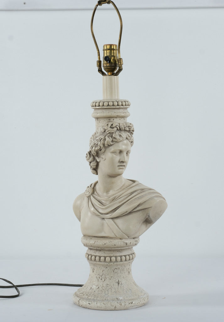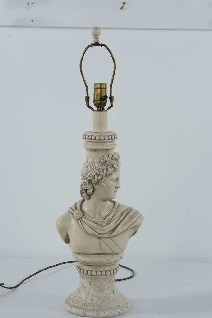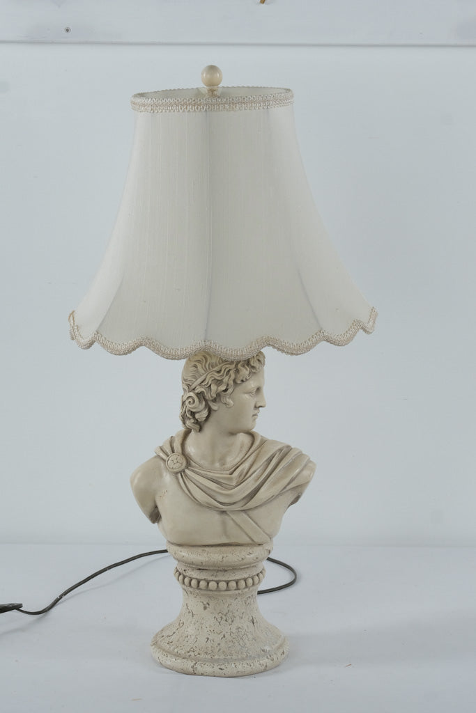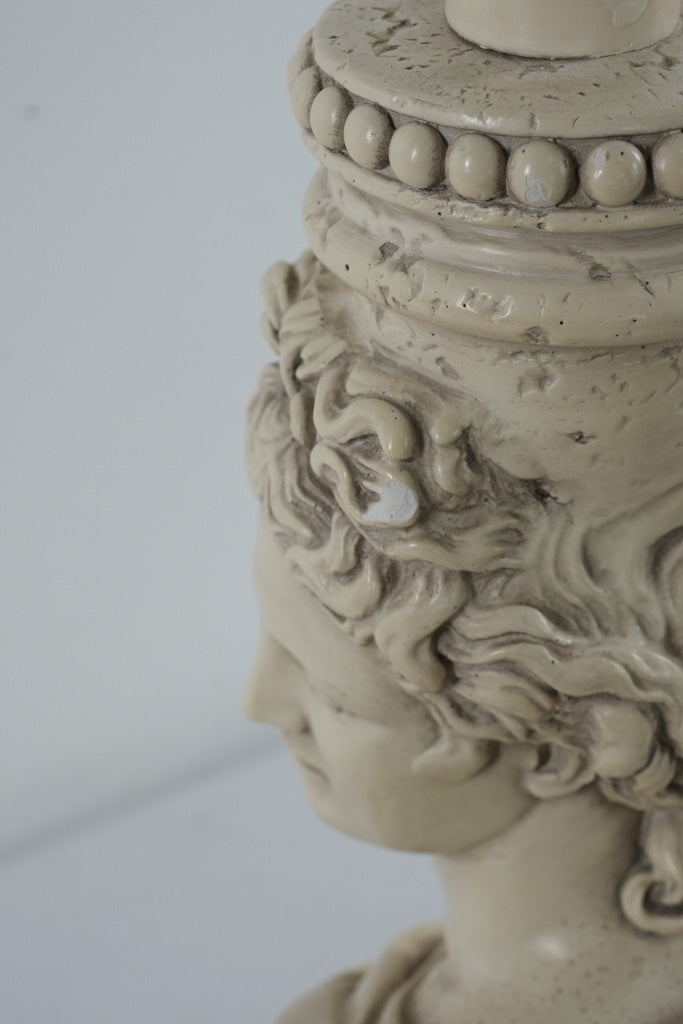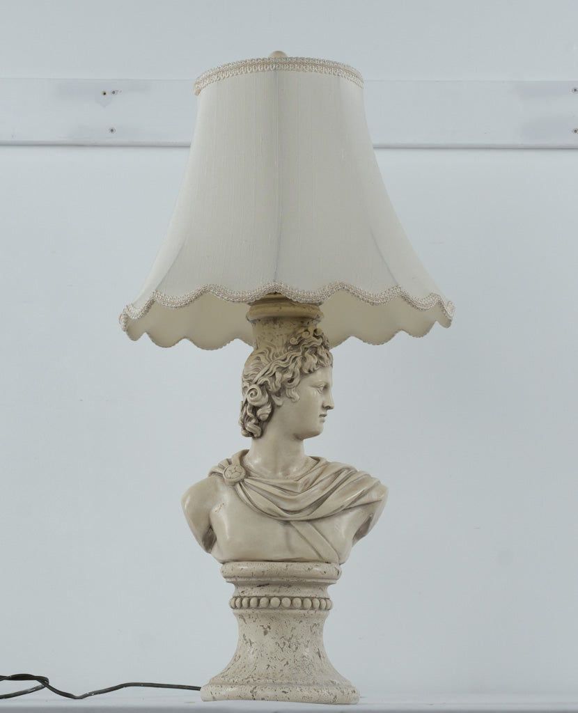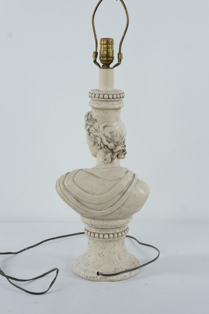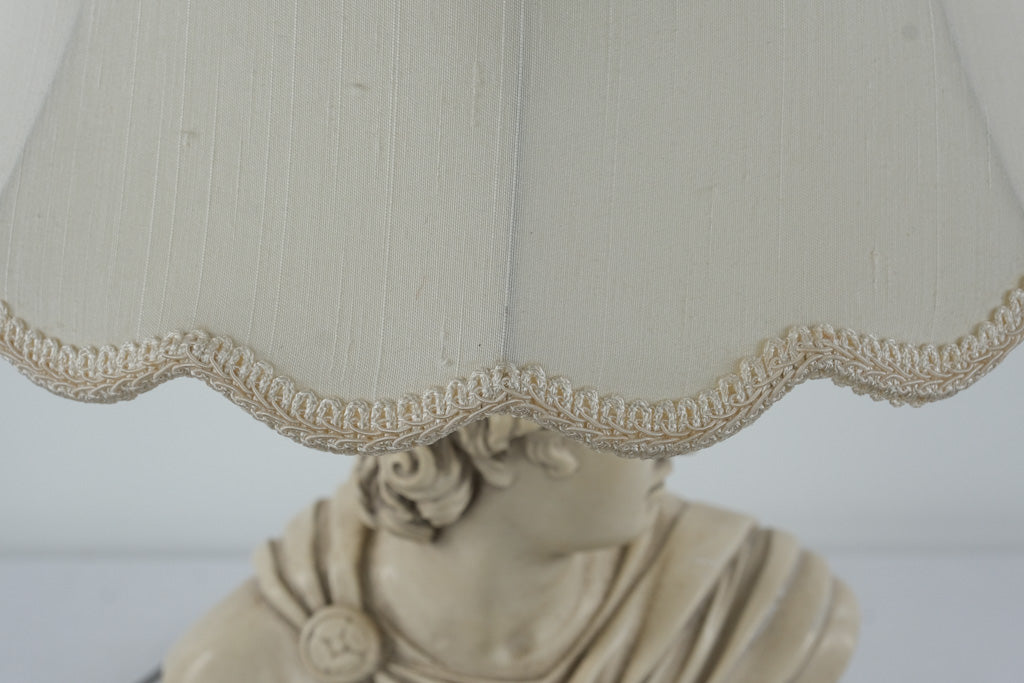 Add a touch of timeless grandeur to your space with this Regal Greek Bust Lamp by Alsy, dated 1990. Crafted in a neoclassical style, the lamp base is formed as a detailed bust reminiscent of ancient Greek statuary, complete with intricate drapery and textured accents.
