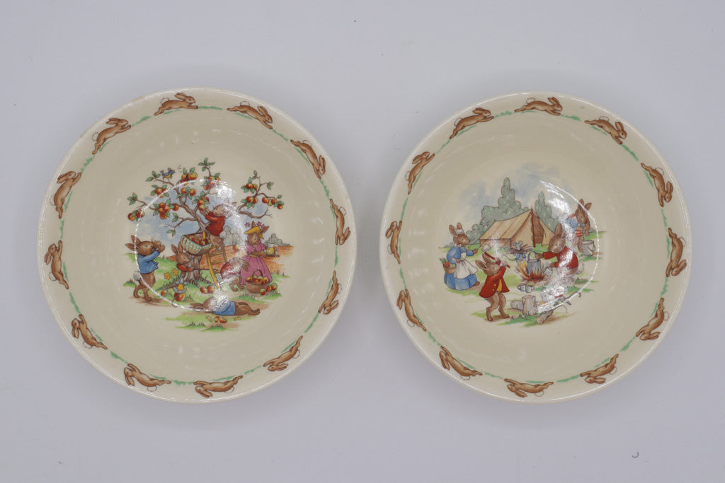 Charming pair of Royal Doulton Bunnykins porcelain bowls, featuring delightful scenes from everyday bunny life. These whimsical illustrations have been a beloved part of children’s tableware since the 1930s, cherished by families and collectors alike.