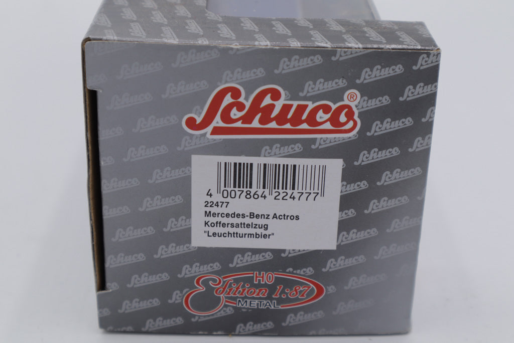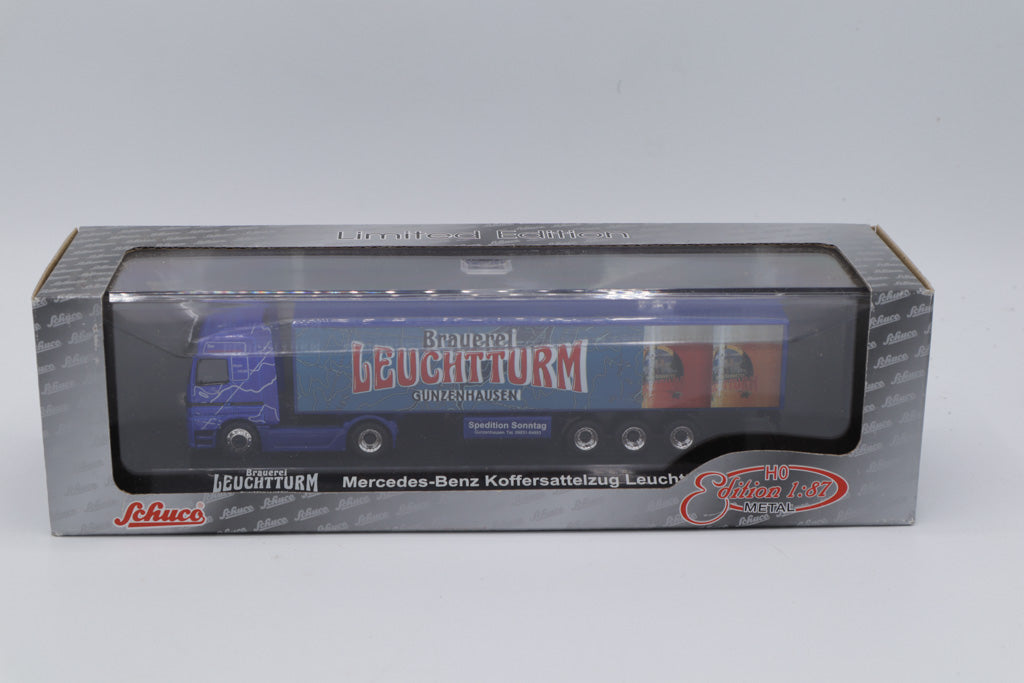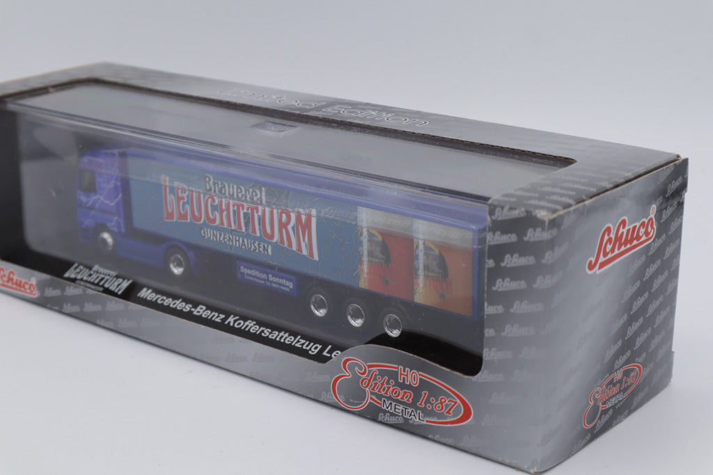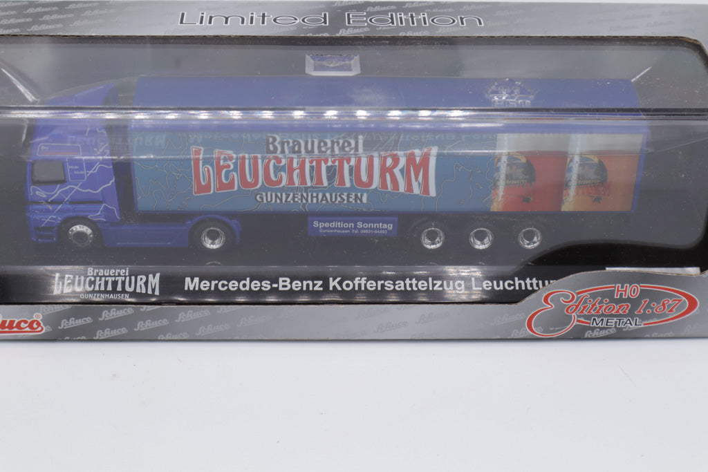 This Schuco HO Edition 1:87 diecast model features a Mercedes-Benz Actros box trailer truck decorated in the colorful livery of Brauerei Leuchtturm Gunzenhausen beer. Produced as a Limited Edition release, it’s a great collectible for fans of brewery advertising trucks, German promotional vehicles, and Mercedes-Benz models.